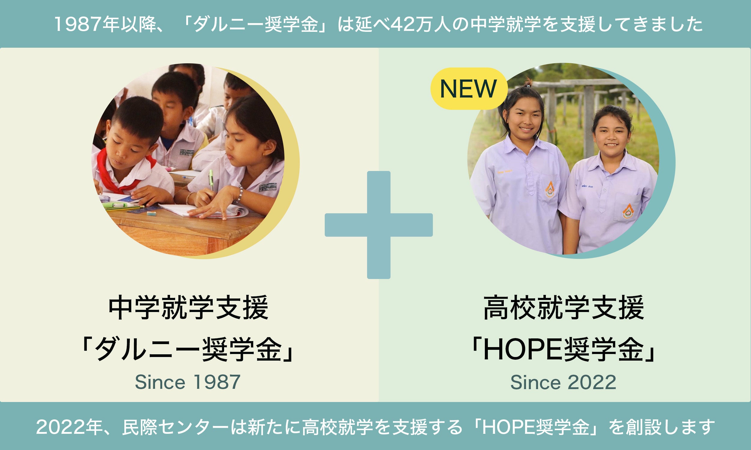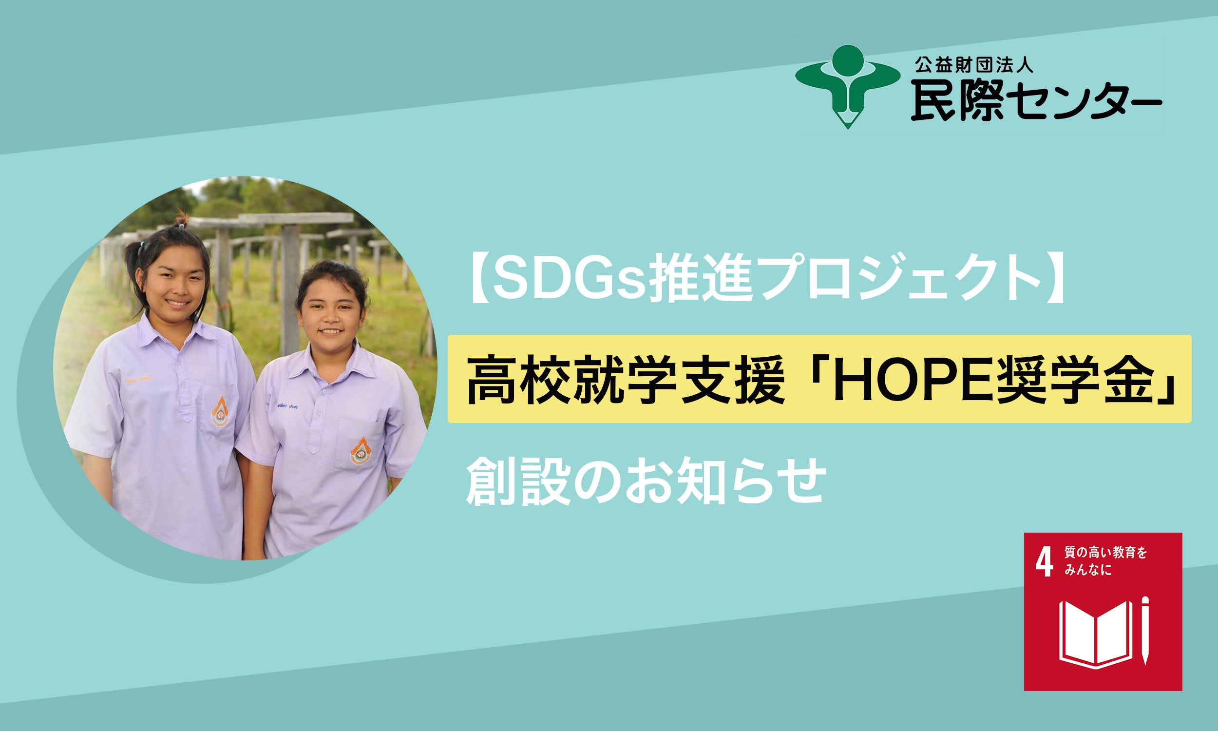東南アジア5カ国の子どもたちへ中学就学支援を行う公益財団法人 民際センター(所在地:東京都中央区、代表理事:秋尾 晃正)は、新たに高校就学を支援する「HOPE奨学金」を創設したことを発表します。