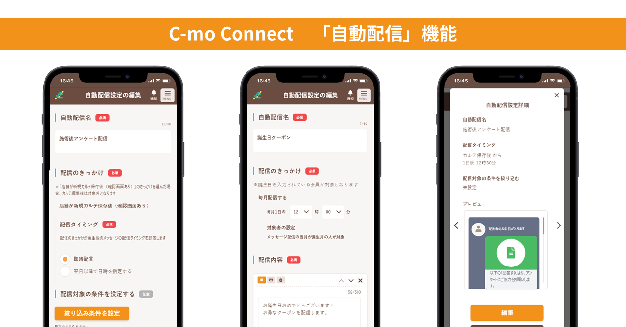 「自動配信」機能は、美容室・美容サロンの「C-mo」導入店舗様が無料でご利用いただけます。