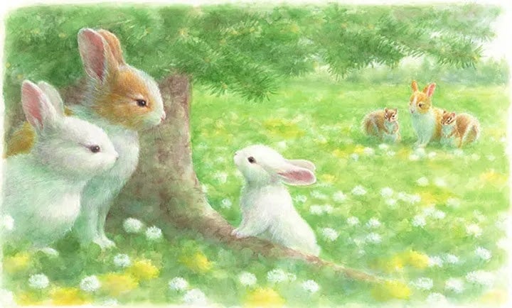 ウサギのほかにも、リスなどの小動物、草花など、画伯がその生命力や美しさに感心した事柄を題材に描かれています。