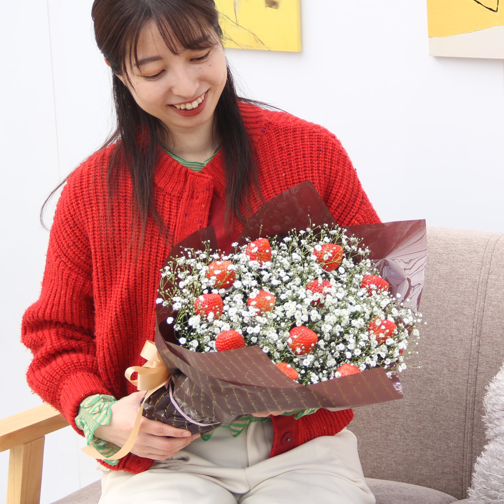 新品種いちごと、かすみ草の一大生産地として知られる地元のかすみ草をたっぷり使うことで、味も見た目も地域らしさを感じられる一束に。