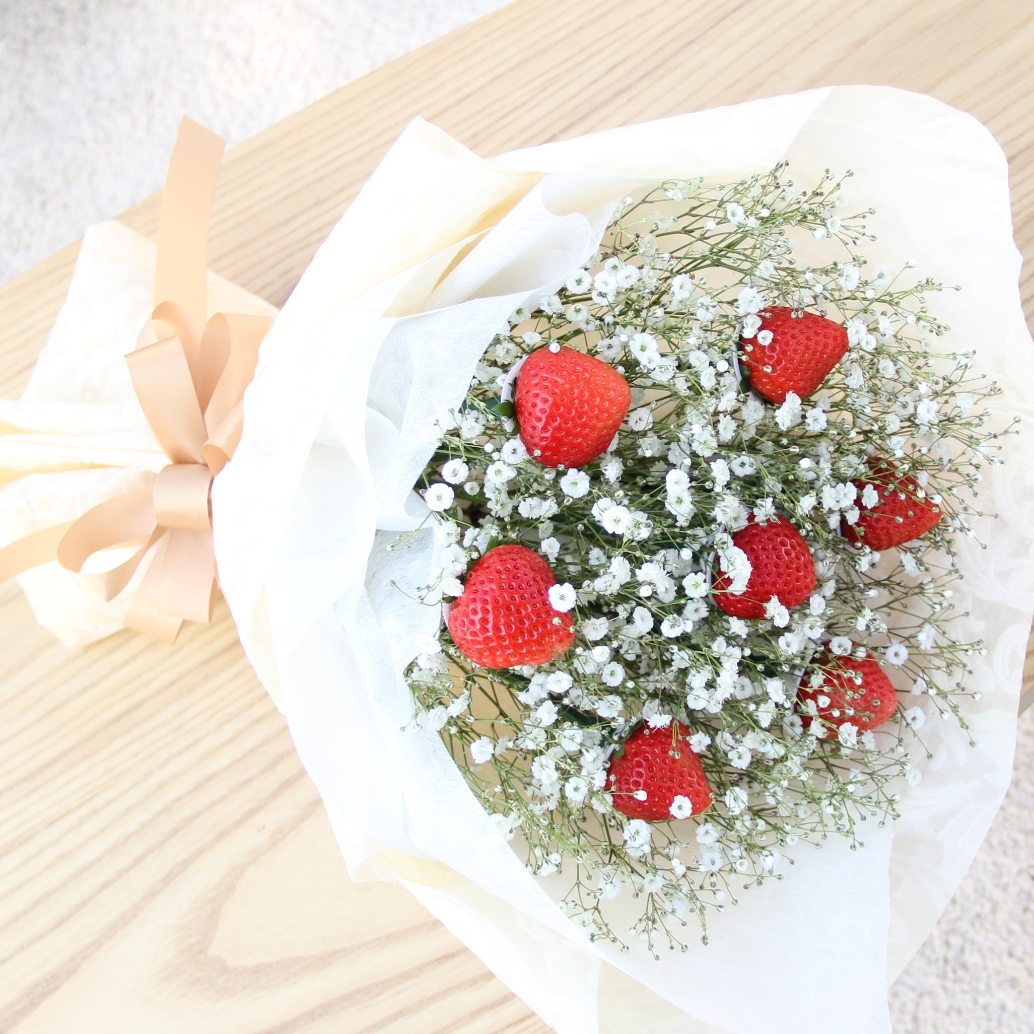 完熟いちごと白いかすみ草だけでつくる、ありそうでなかった いちごの花束です。