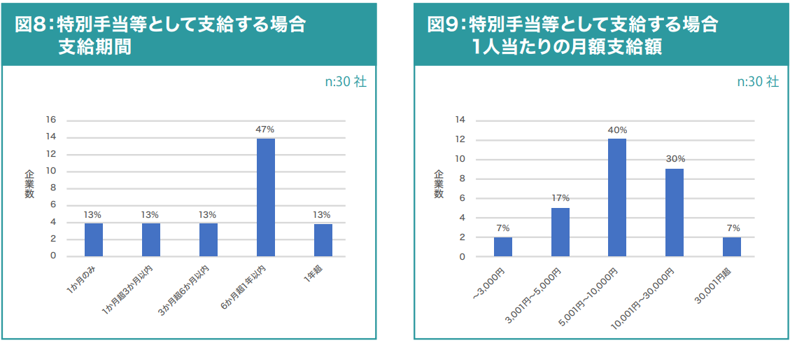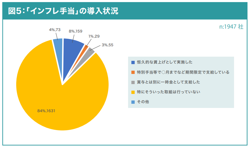 「その他(4%)」を選択した企業の回答内容をみると「今後の支給を検討している」という回答が多かった。ほかにも「ガソリン等高騰しているため、通勤手当の見直しをした」、「冬季賞与に上乗せする」、「扶養家族がいる社員の家族手当を増額した」といった回答が見られ、これらの企業ではインフレ手当にこだわらず独自の対応を行っていることがわかった。