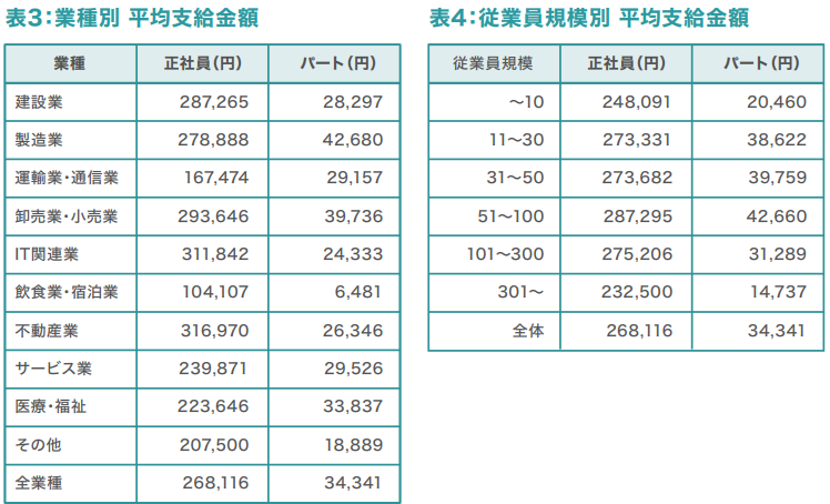 賞与を支給している企業の平均支給額は正社員26.8万円、パート社員3.4万円であった。業種別にみると不動産業(31.6万円)、IT関連業(31.1万円)が高く、飲食業・宿泊業(10.4万円)が低い傾向にある。従業員規模別にみると、正社員の支給額は300名以下の企業ではいずれも20万円台で、大きな差がないことがわかる。厚生 労働省が公表している「毎月勤労統計調査」では、従業員規模に比例して平均支給額が増加する結果となっているが、今回の調査ではその傾向は見られなかった。