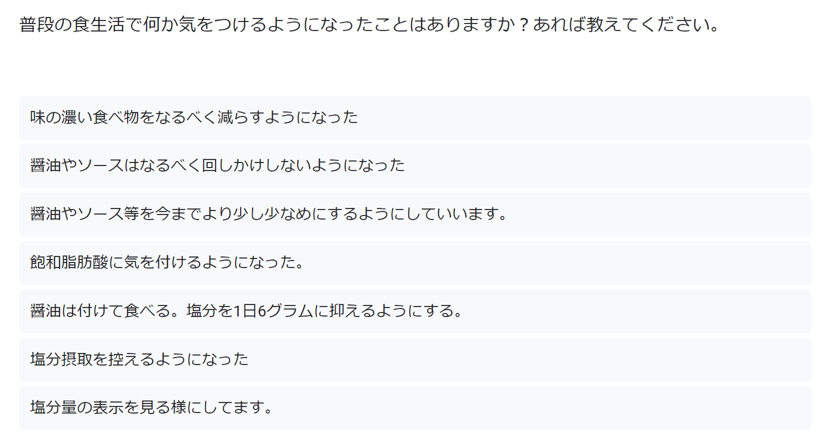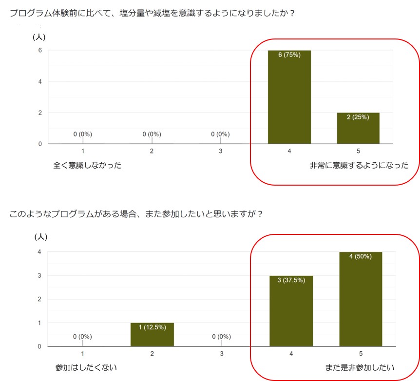 3か月で計6回のプログラムを行い、開催後に行ったアンケートでは、参加者の全員が、「プログラム体験前に比べて、塩分量や減塩を意識するようになった」と回答しました。また、参加者の75%が「高血圧や減塩に対する知識が深まった」と回答し、今回のプログラムが従業員の健康意識を大きく向上させることが明らかになりました。さらに、参加者の多くが、自炊の大切さを実感し、醤油やソースのかけ方を気を付けるなど塩分摂取を控えることを意識し、日ごろの生活に反映していると回答しています。参加者のほぼ全員がこのようなプログラムにまた参加したいと回答しており、満足度が高い結果となりました。
