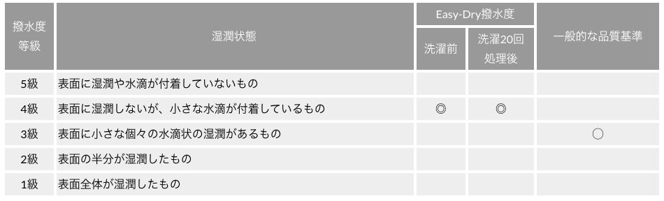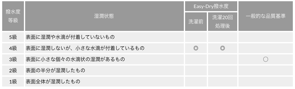 撥水試験は、生地を人工的に劣化させるため、洗濯を行います。一般的な品質基準では、洗濯3回後の等級が3級で合格となりますが、Easy-Dryは洗濯前撥水度4級、洗濯20回後でも撥水度4級という高い撥水持続性が第三者検査機関で証明されています