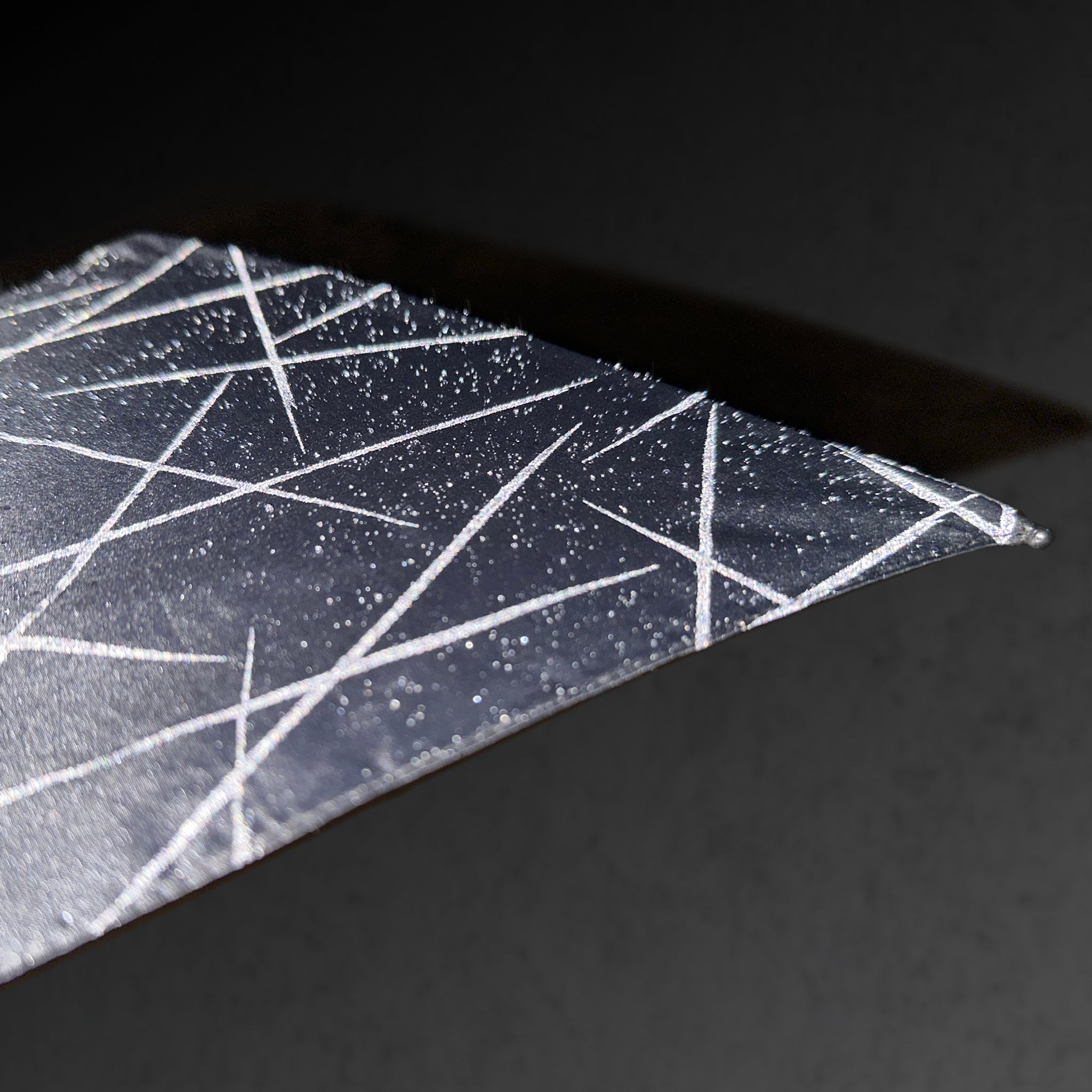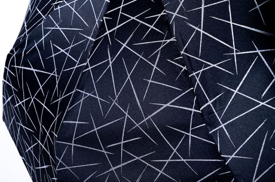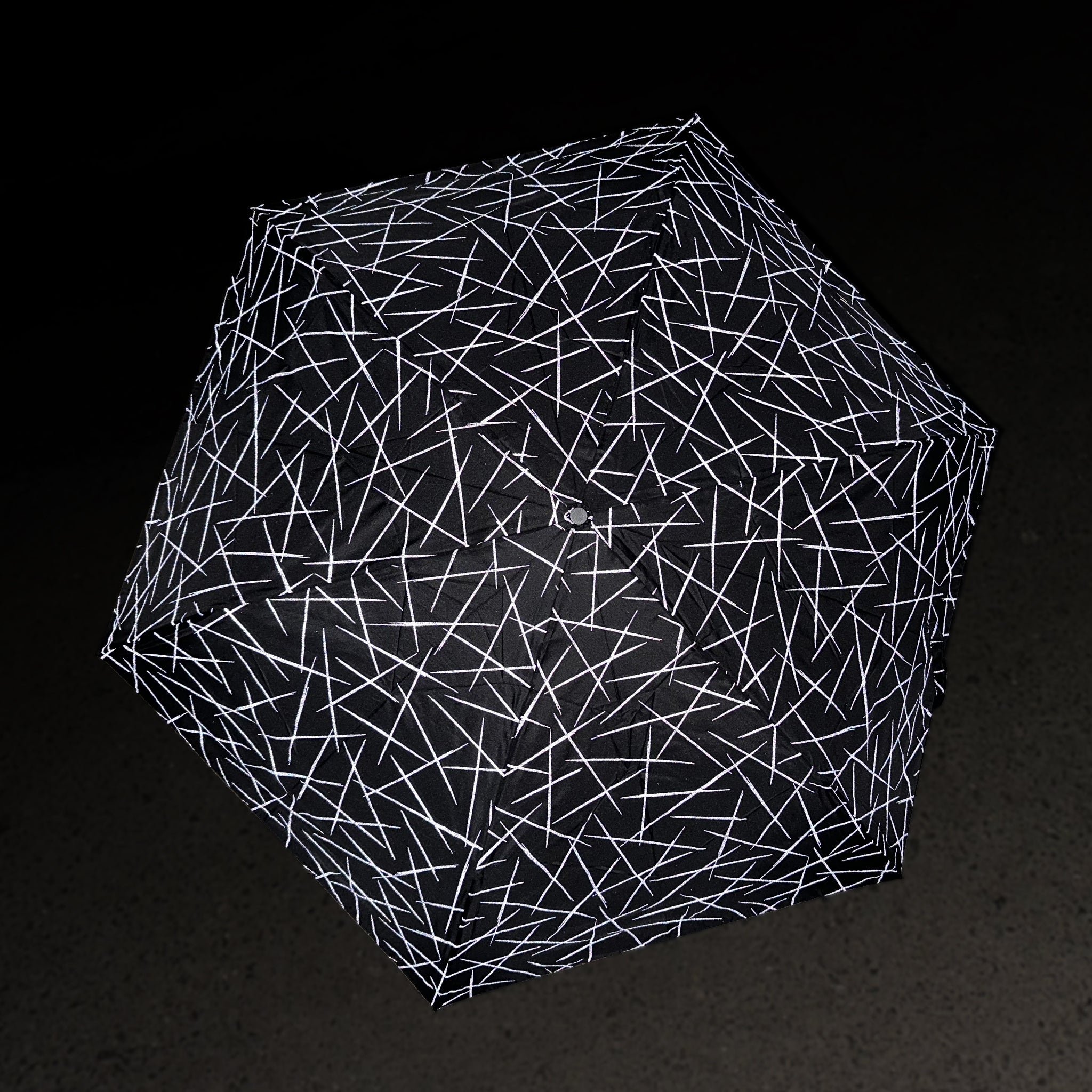 通常ではブラック1色に見える傘は、光が当たると再帰反射デザインが浮き上がってみえます。