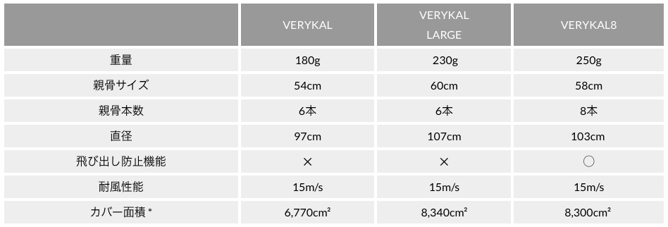 サイズ感はVERYKAL LARGEに近いですが、8本の骨で生地を支えますので、風に対して安定し、裏返りにくくなります。