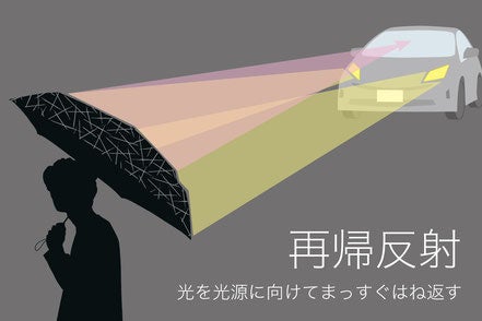 当たった光は光源に向けてまっすぐ反射するので、例えばクルマのヘッドライトが点灯している場合はドライバーに対してのみ視認性が高くなります。