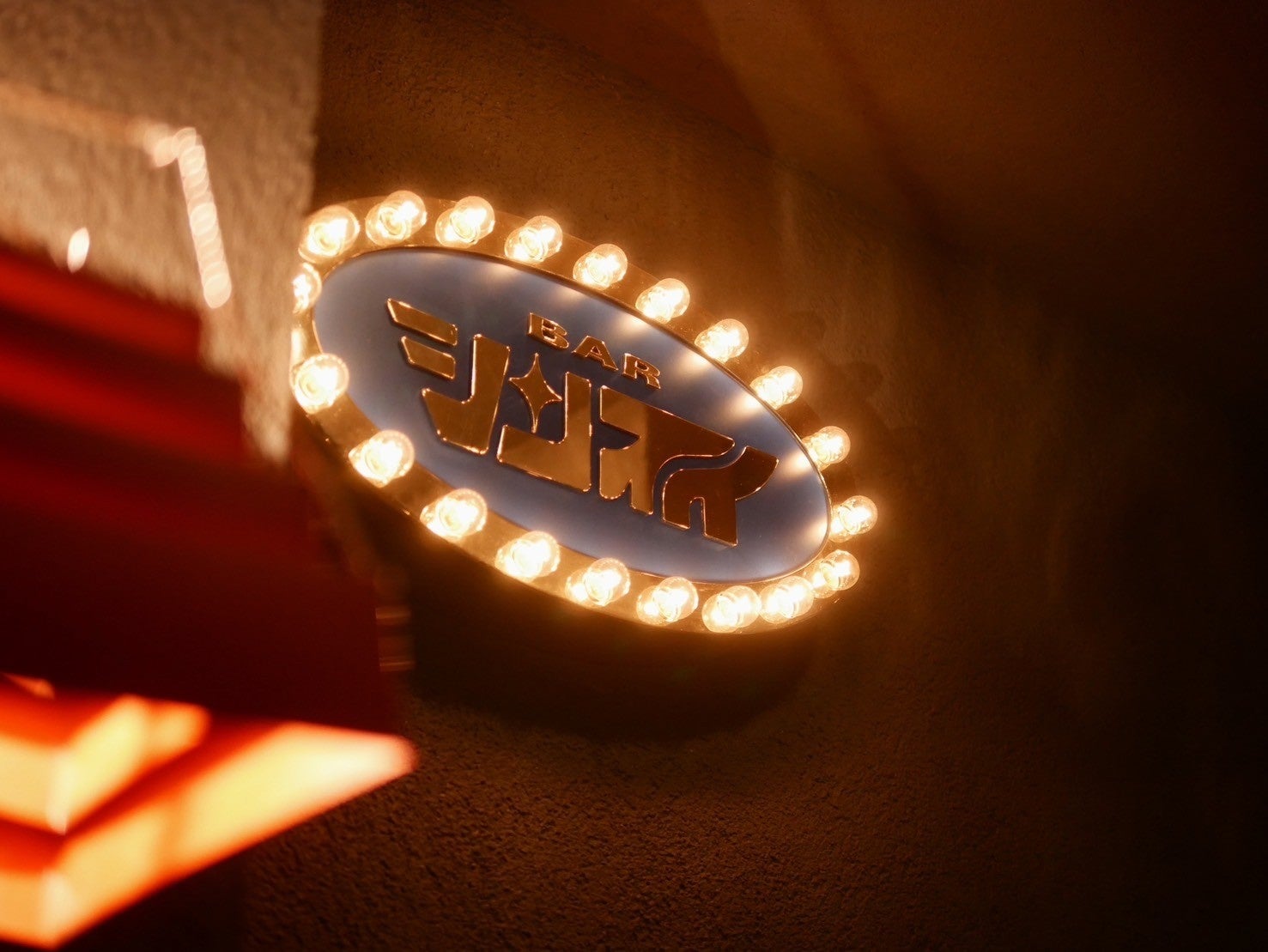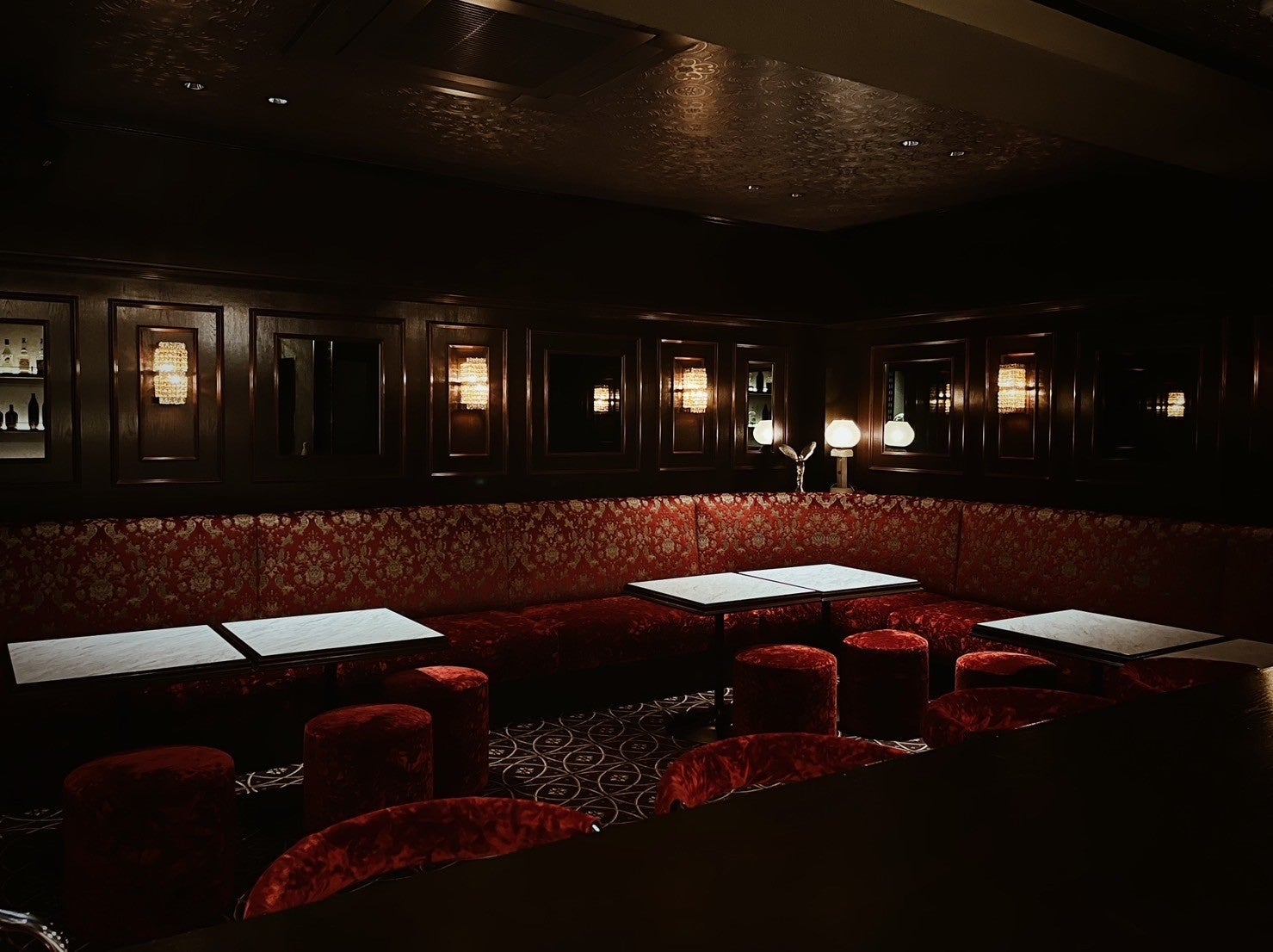 真鍮フレームと白熱電球で彩られたサイン看板・メタリックタイル・ベロアと刺繍ファブリックのソファー・大理石のテーブルはキャバレーをイメージとした要素に。