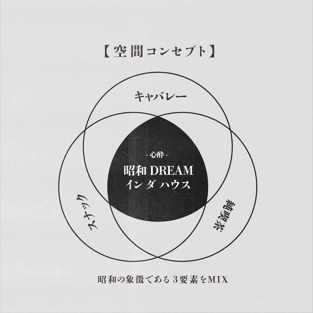 モットーや空間、一貫して私たちが大切にしているのは“昭和時代”です。当時の象徴とも言える、スナック・キャバレー・純喫茶が徐々に衰退している今、活気が溢れていたあの時代を取り戻したいという想いから、これら3つの要素を抽出し、「昭和DREAM イン ダ ハウス」をコンセプトに空間装飾を考えています。