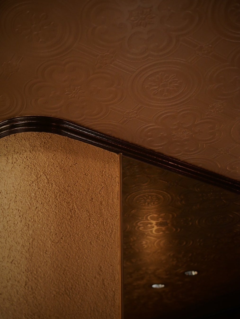 しかし、現代に対してのフィット感を考える上ではそれらがそぐわない点もあると考えたため、取り合い部分には細い見切りを入れ、他の部材に干渉しないような納まりを検討し、天井照明ではクロスのエンボス位置に合わせてグレアレスダウンライトを配置するなど、各仕上材や設備機器がポテンシャルを最大限発揮できるような納まりとすることで、現代的な内装に見られる清朗さを担保し、ノスタルジーな世界観の中にもモダンな空気を感じる内装へと昇華させています。