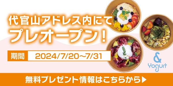 正式オープンに先駆け、代官山アドレス内にて期間限定オープンいたします。期間中は& YogurtのLINE公式アカウント登録&SNS投稿でお試しハーフサイズのテイクアウトグリークヨーグルト(定番コムハニー・生ハムアボ・抹茶のいずれか1点)を無料プレゼント!