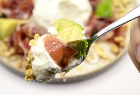スペイン産の14カ月熟成された生ハム「ハモン・セラーノ」と新鮮なアボカドがヨーグルトとよく合う食べ応えある商品です。 ノンフライ製法の焼きココナツに食物繊維豊富なグラノーラ、無添加アーモンド、オーガニックカルフォルニアレーズンを一緒に盛り付け、さっぱりとしたハンガリー産アカシアハニーをかけています。