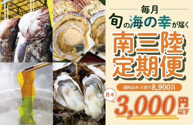 宮城県南三陸町で、地域の観光資源を活用した観光事業に取り組む一般社団法人南三陸町観光協会(所在地:宮城県南三陸町、会長:及川吉則)では、1月~3月限定で、海の幸サブスクリプションサービス「南三陸定期便」を提供いたします。月額3,000円以下(税込)で、毎月異なる南三陸産海産物(2人前程度)をお届けします。漁師が獲れたてを送る新鮮な海の幸、海産物の加工会社がつくる食べやすいお魚セットなど、都市部では、中々味わえない鮮度の高い食材をお楽しみいただけるサービスです。