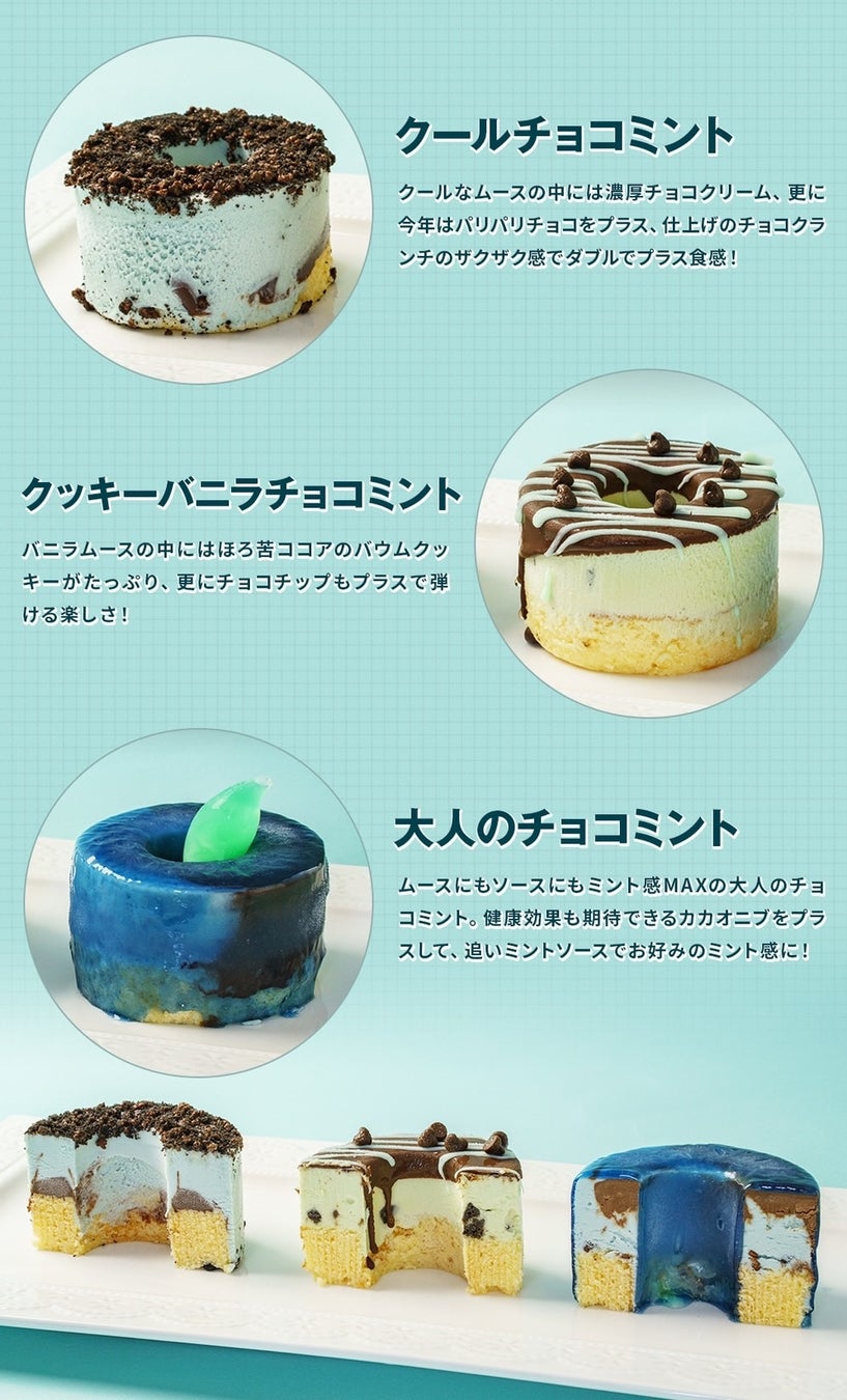 クールなムースの中に濃厚チョコクリームを忍ばせてマイルドながらしっかりミントを感じられるムースに仕上げ、更に今年はパリパリチョコとザクザクチョコクランチをたっぷり乗せた食感も楽しいバウムクーヘン。