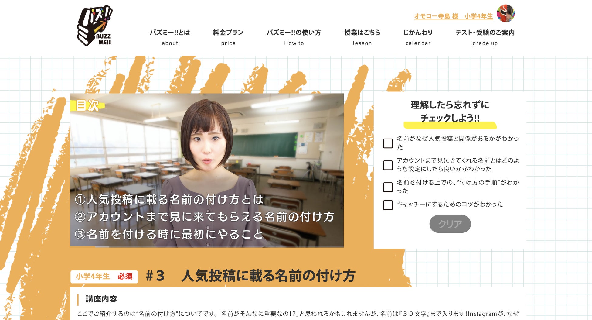 学校の世界観を舞台としているバズミー!!は、入会時は小学校1年生というランクからスタート。学年を上げるために、必須授業の視聴、選択式テストや講師からの採点など、ゲーム感覚で小学校〜高等学校までの学年に応じた難易度のノウハウを習得することができます。