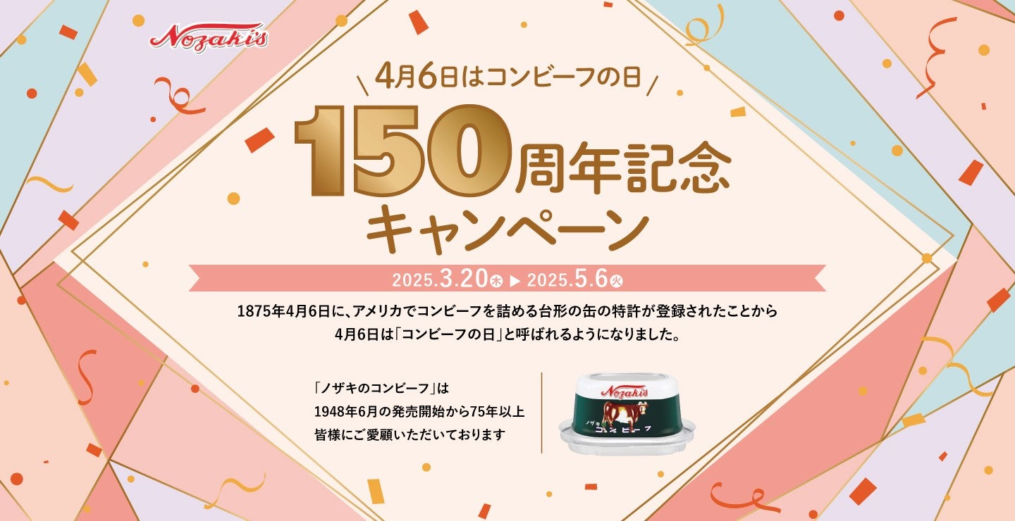 JFE商事グループの川商フーズ株式会社(代表取締役社長:中村行盛 本社:東京都千代田区)は、ノザキのコンビーフブランドサイトにて、4月6日の"コンビーフの日"にちなんで、合計460名様に総額約130万円以上相当の商品券やノザキ製品等が当たる「"コンビーフの日"150周年記念オープンプレゼントキャンペーン」を2025年3月20日(木)より開始いたします。