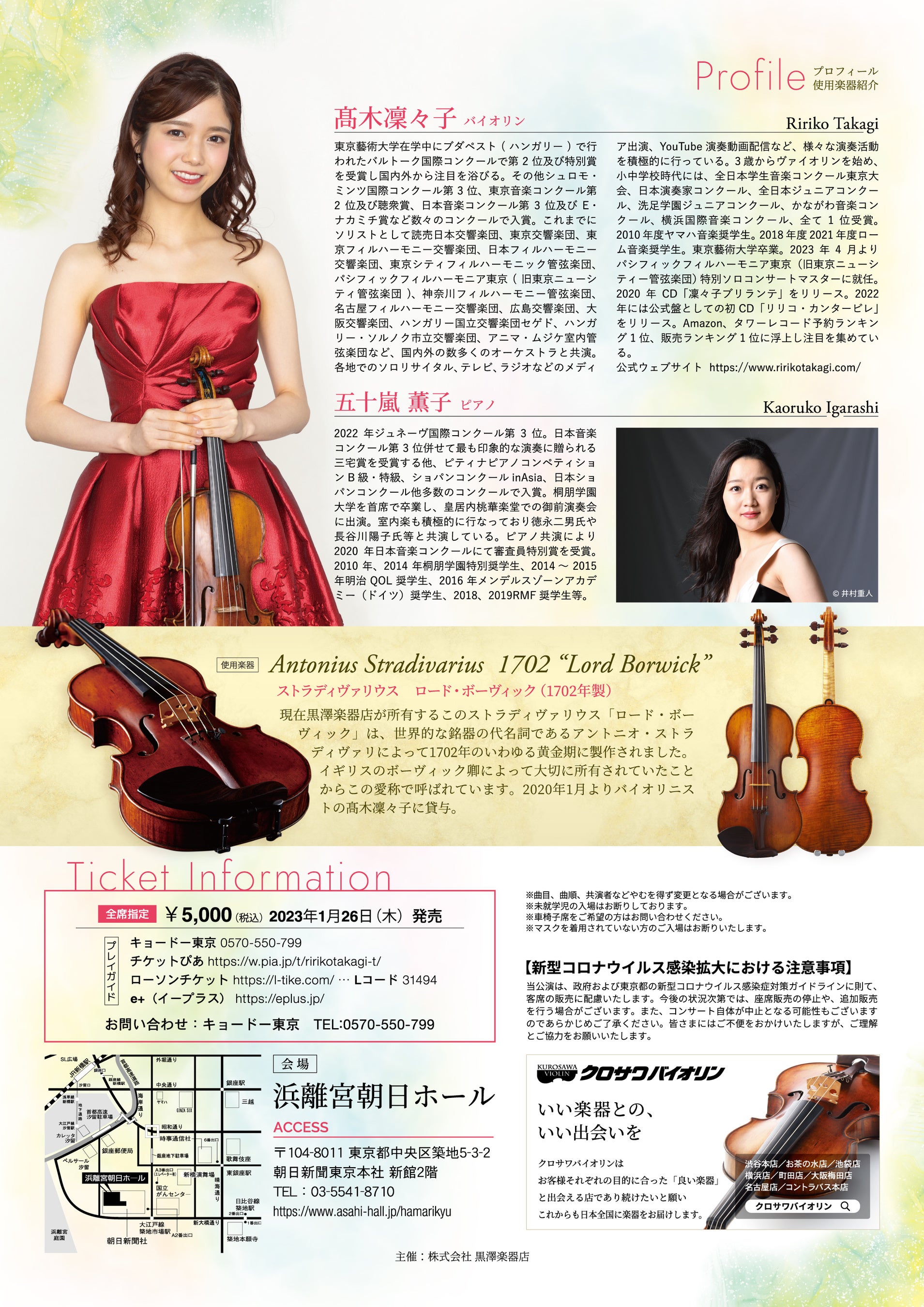 世界的な銘器 アントニオ・ストラディヴァリウス 1702年製“Lord Borvick“ の音色を楽しめる「髙木凜々子 バイオリン・リサイタル」が浜離宮朝日ホールで開催。