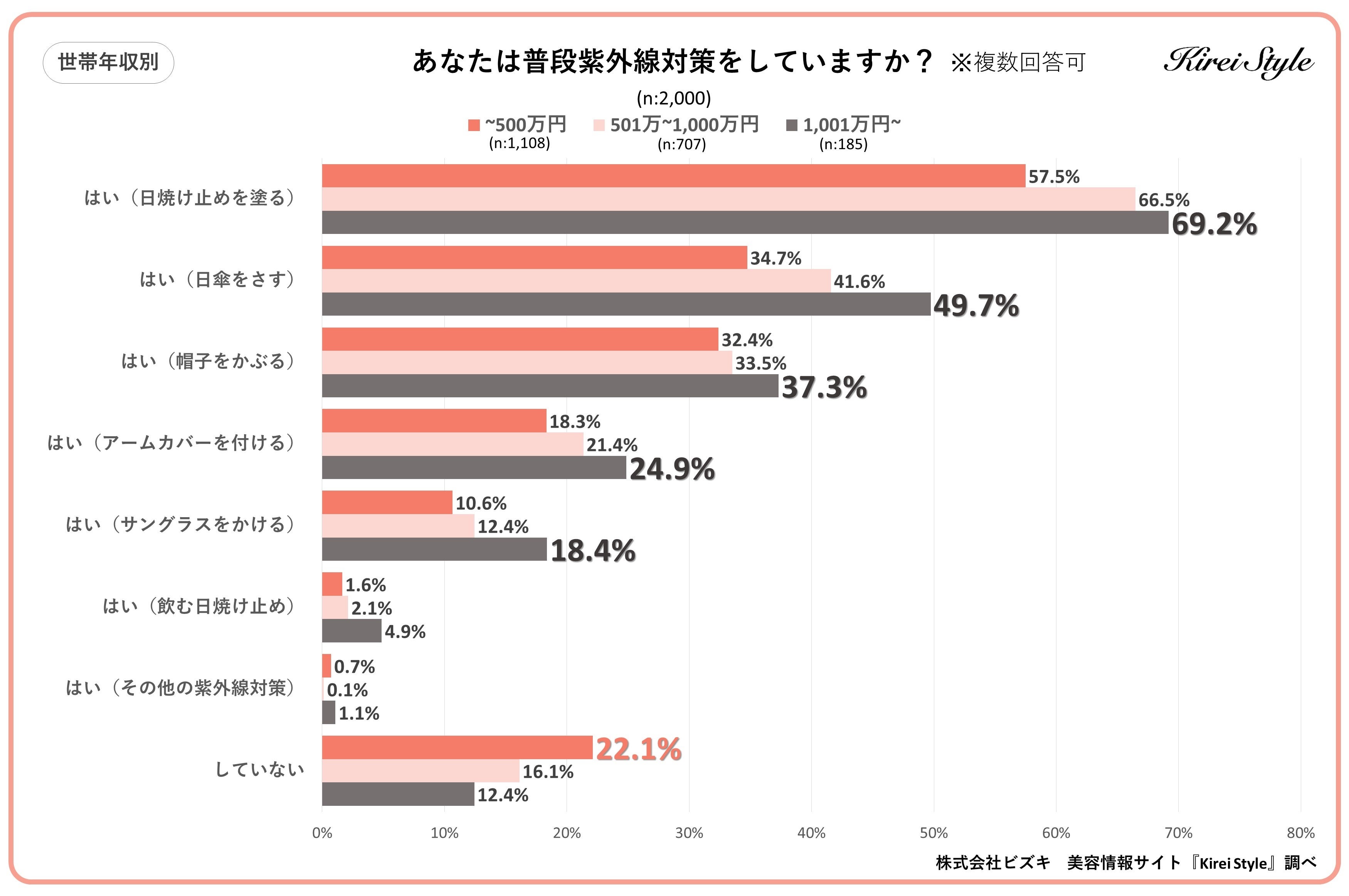 世帯年収別にみると、世帯年収が高いほど紫外線対策を行っている割合が高いという結果になりました。「日焼け止めを塗る」「日傘をさす」「帽子をかぶる」「アームカバーをつける」「サングラスをかける」「飲む日焼け止め」という6つの項目において、世帯年収と回答率の高さが比例関係になっていることが分かります。