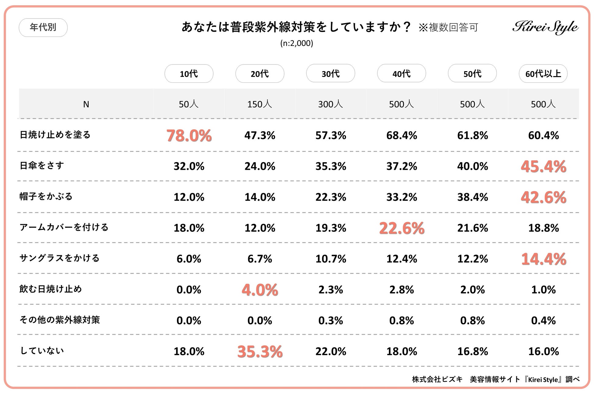 また、年代によって選択する紫外線対策が異なることも今回の調査によって明らかになってきました。