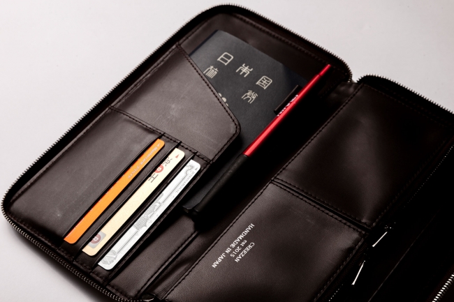 旅の必需品が全て収まるトラベルウォレットです。表のポケットは航空券、内側のポケットにはパスポートを入れることができます。また、小銭入れとお札入れが2つずつあるので、旅先で外貨を分けて収納できて便利です。