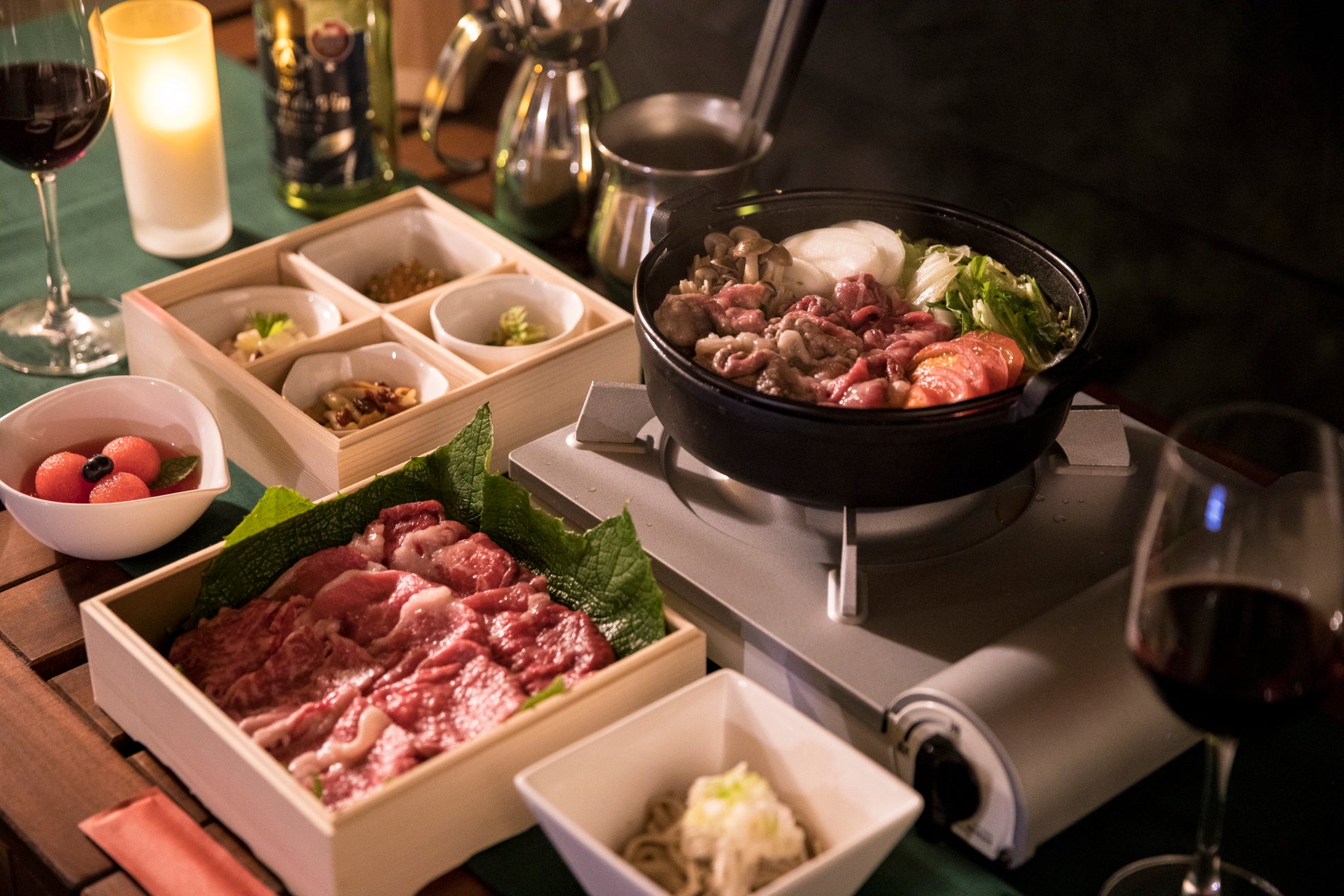 会場内の光や調理器具に必要な電力は全て電気自動車(EV)を活用することで賄い、大自然の中にいながら快適でラグジュアリーな空間のご提供が可能に。時間とともに移ろう自然の景色は、日常の疲れを癒し、自然への畏敬の念を思い起こす、都会では味わえないサステナブルなグランピングディナー体験となります。結婚記念日や誕生日など、特別な記念日でのプレゼントとしてもご好評いただいている本プログラムを、是非体験しに来てください。