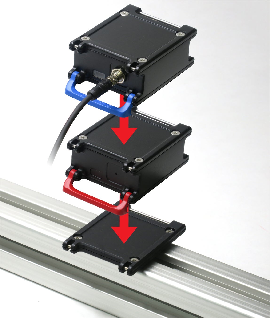 設置に使う取付ベースは、Tスロットやイレクターなど現場でよく使われる汎用部材にあわせてラインアップ。スタックしてワンタッチでロックできるため設置がかんたんです。防水・防塵仕様のため設置場所も選びません。移動や変更もかんたんです。