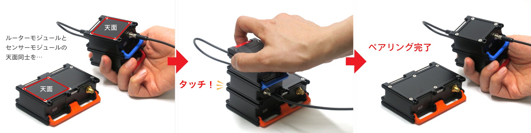 センサーモジュールとルーターモジュールは天面同士をタッチするだけでペアリングおよび設定の解除が可能。現場でのネットワーク設定がスピーディに完了します。
