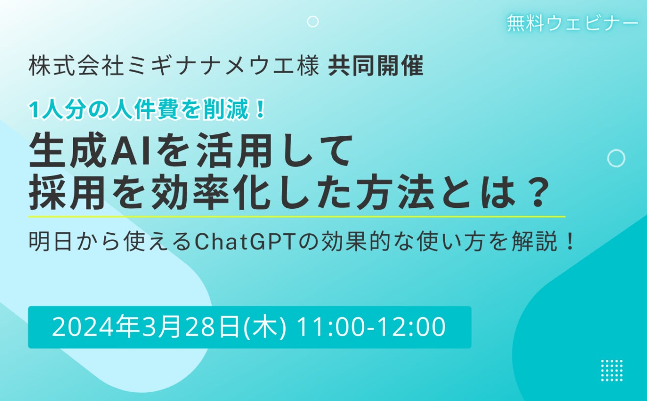 月間130万PVの生成AIメディアを運営するWEELが、株式会社ミギナナメウエとの共同セミナー「【一人分の人件費を削減】生成AIを活用して採用を効率化した方法とは?」を開催します!