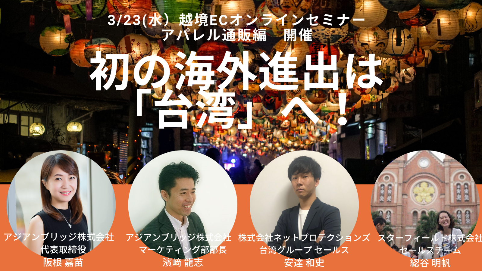台湾やタイを始めとしたアジアへの越境ECを支援するアジアンブリッジ株式会社(本社:東京都千代田区、以下アジアンブリッジ)は越境ECセミナー「アパレル通販、初の海外進出は台湾へ!」にて台湾越境ECの特徴、運営手法、準備内容を解説します。セミナー開催は3月23日(水)14:00~15:30。Zoomによるオンラインで行います。参加費は無料。