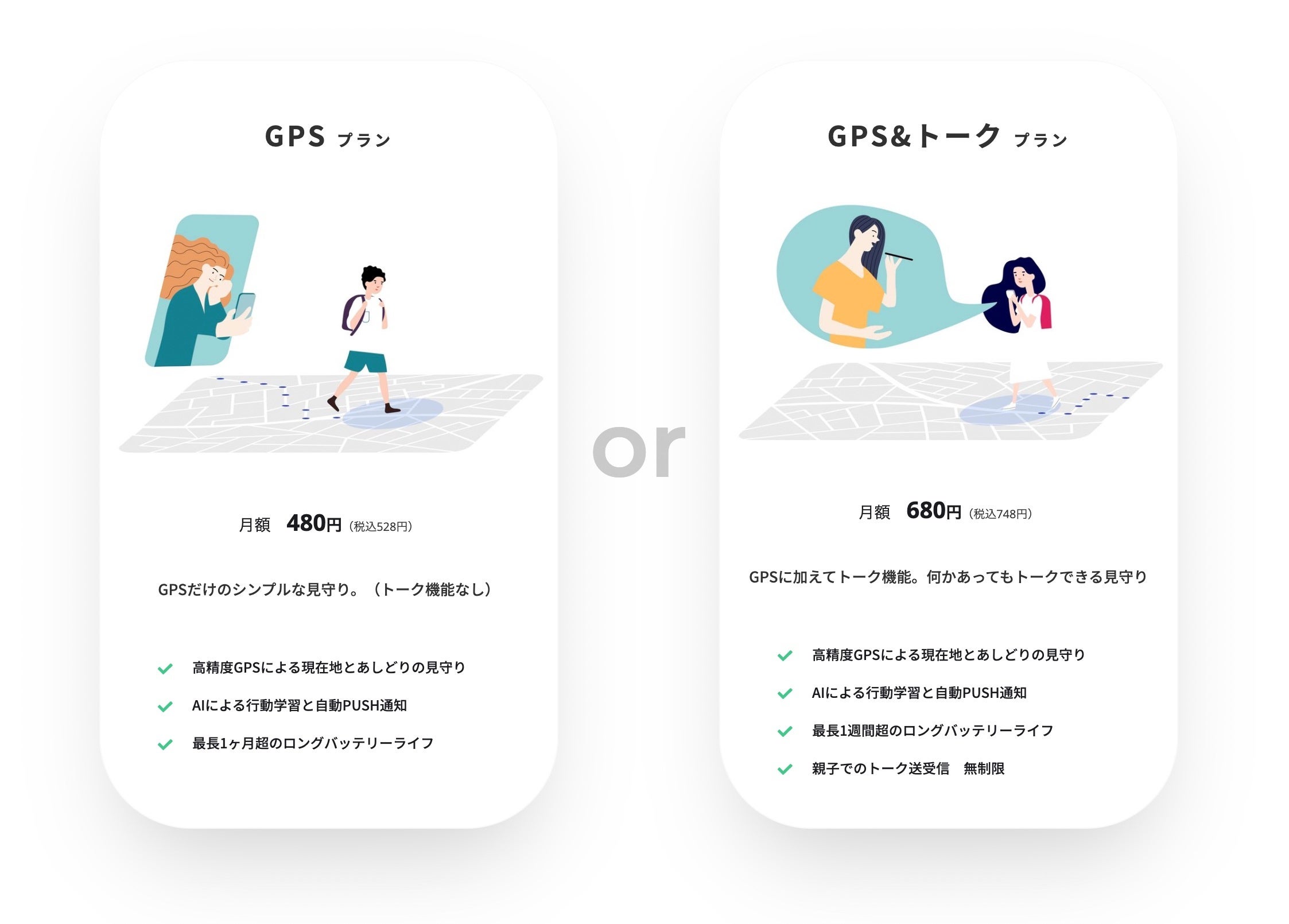 | GPS&トークプラン | GPSに加えてトーク機能。何かあってもトークを送受信できる見守り。 最長一週間以上のロングバッテリーライフ |