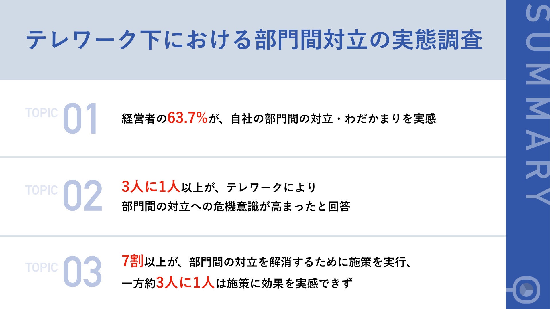 - 3人に1人以上が、テレワークにより部門間の対立への危機意識が高まったと回答