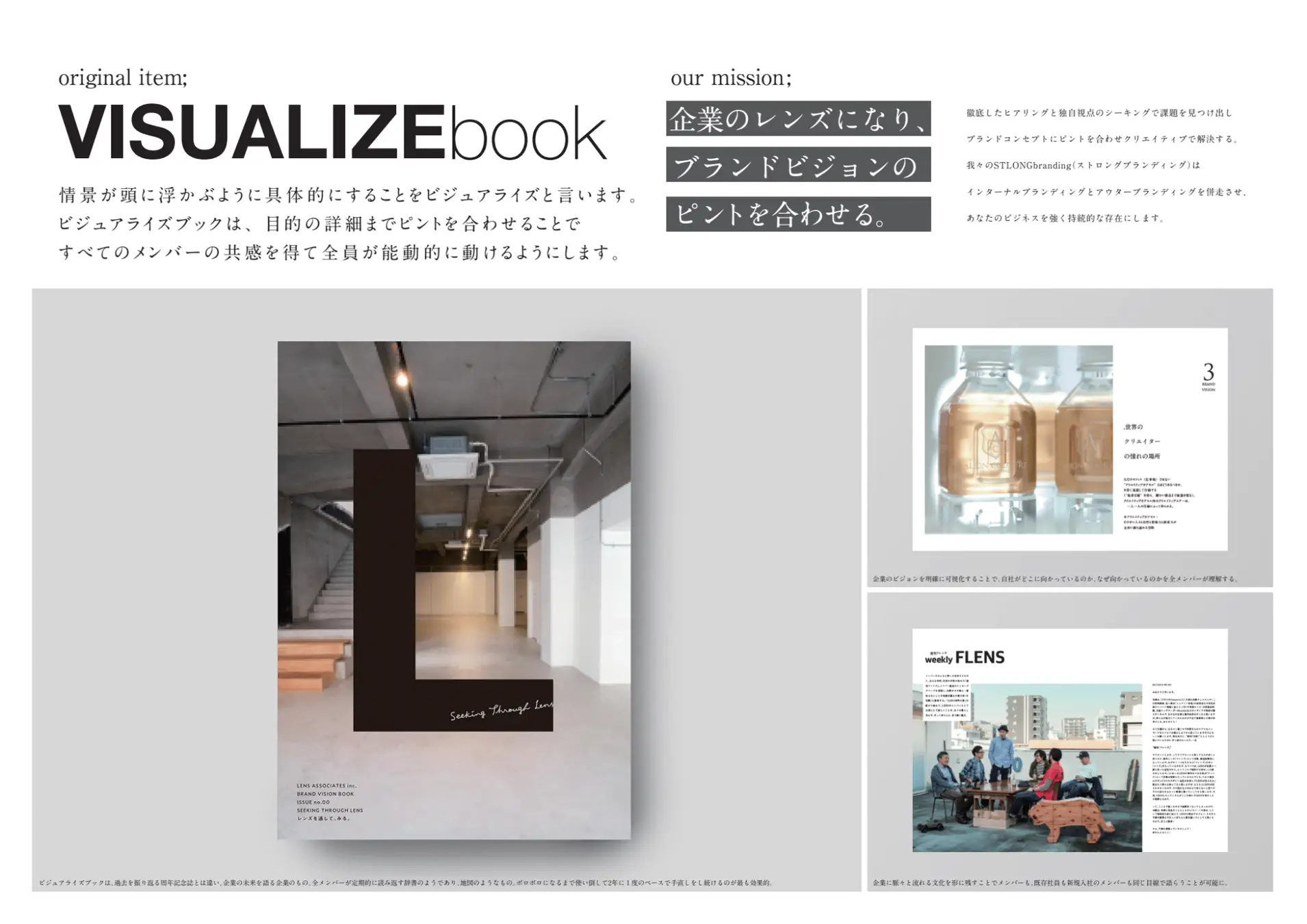 VISUALIZEbook(ビジュアライズブック)は、企業のパーパス(使命)やビジョンにピントを合わせて可視化する、理念浸透のバイブルと呼べるツール。雑誌風の誌面デザインで、すべてのメンバーの共感を得て全員が能動的に動けるようにします。