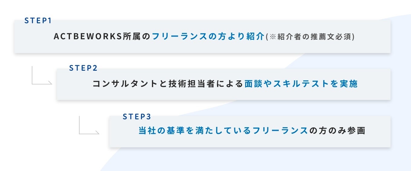 ACTBEWORKSには誰でも参加できるわけではありません。登録済みの優秀なフリーランスからの紹介制度を導入しているため、ACTBEWORKSは優秀な人材の輪で成り立っています。