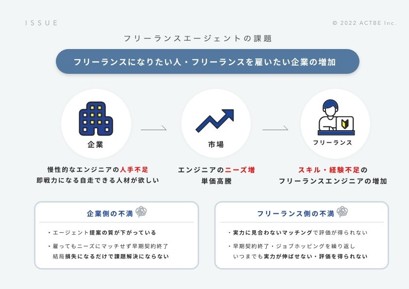 大阪を拠点に、デジタル領域のプロフェッショナルとしてデザインとテクノロジーを駆使し、クライアントのDX支援もとより経営課題の解決を行う株式会社アクトビ (所在地:大阪市西区、代表取締役:藤原 良輔、以下当社)は、企業が抱える課題解決にフォーカスし、マッチする案件としてプロ人材を紹介を行う『ACTBEWORKS』を開始し、フリーランスエンジニアと企業の事前登録を開始します。