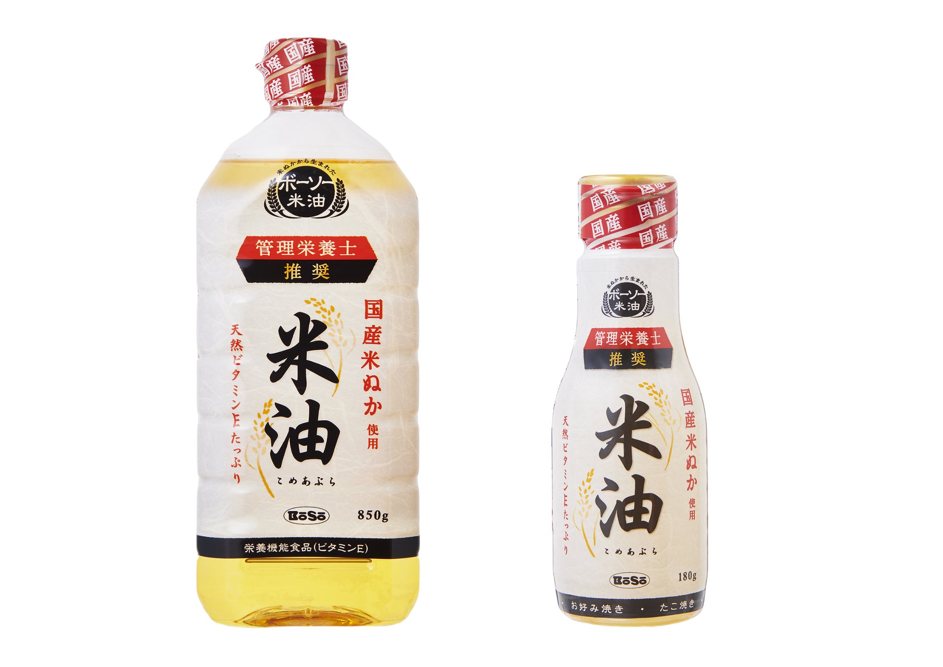 ボーソー米油(左:850g 右:180g):原材料は国産米ぬかにこだわり、米ぬか由来の天然栄養成分が豊富です。酸化しにくく美味しさが長持ちして、どんな料理にも合う万能なオイルです。