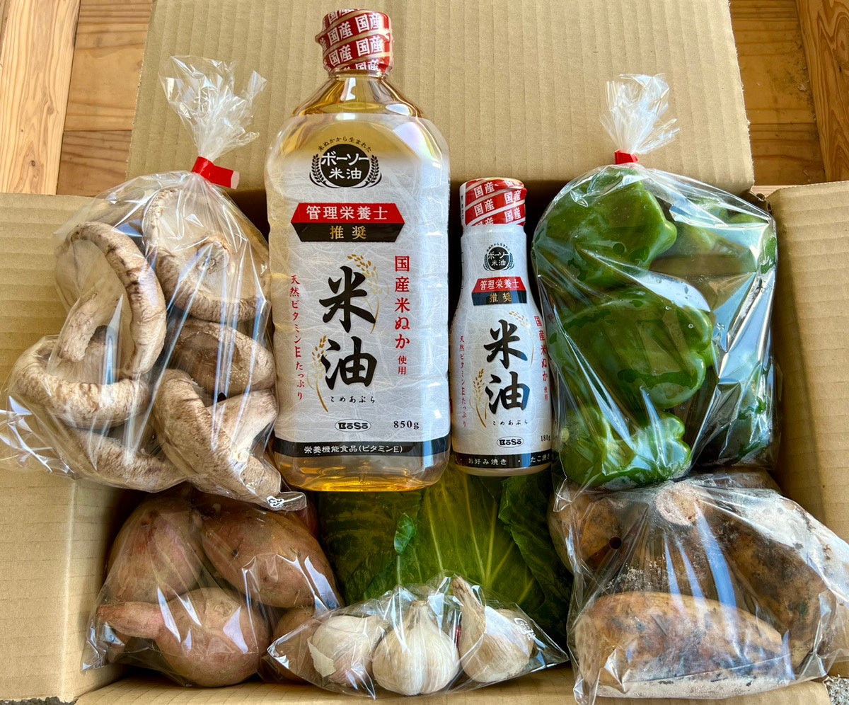 熊本県産または鹿児島県産 規格外野菜6種(キャベツ・安納芋・レンコン・にんにく・椎茸・ピーマン)+ボーソー米油2本セット(850g・180g)を100名様分