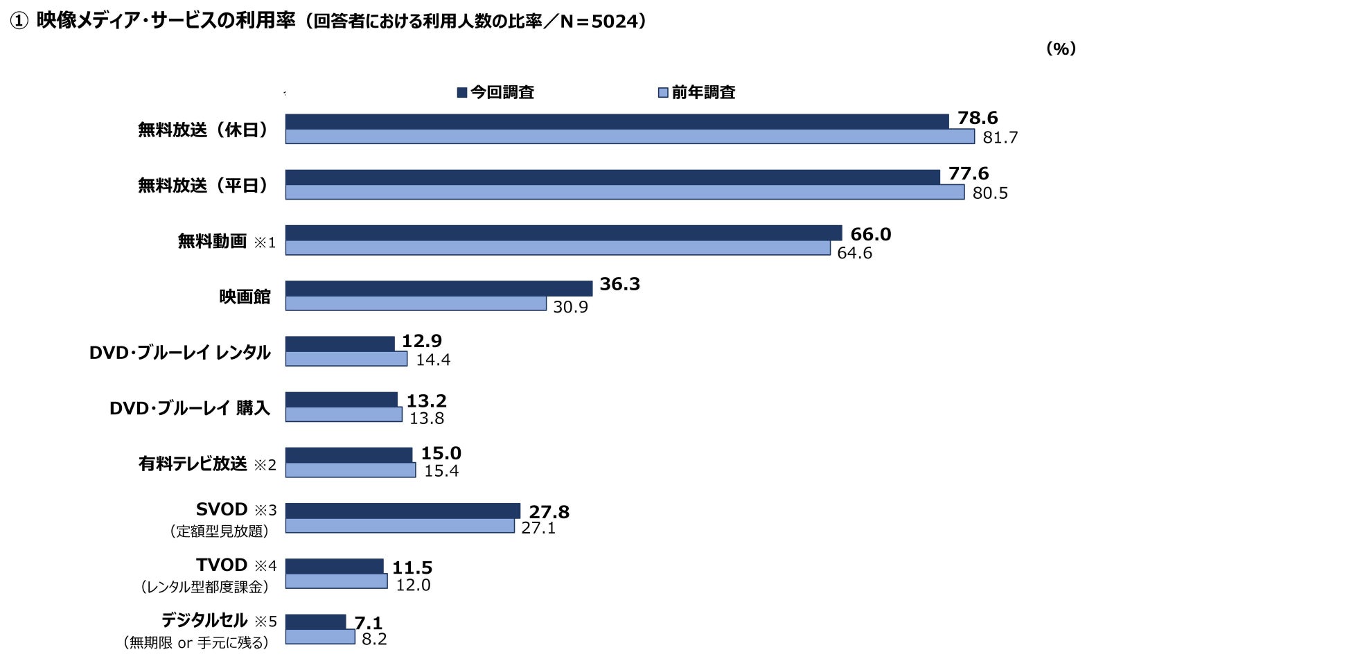 ・調査対象メディア・サービス:映画興行 無料テレビ放送、有料テレビ放送 DVD・ブルーレイのレンタル DVD・ブルーレイの購入、無料動画サービス、定額型動画配信(SVOD)、レンタル型動画配信(TVOD)、デジタルデータでの動画販売(デジタルセル)