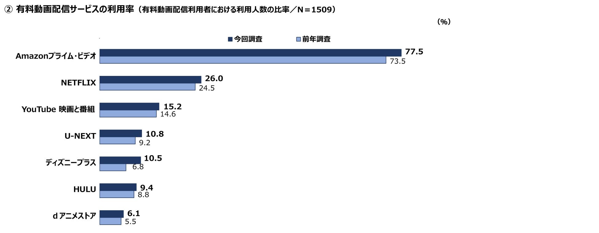プライム会員特典の「Amazonプライム・ビデオ」は前年からさらに利用者を増やし、有料動画配信利用者における利用率は77.5%と8割に迫ります(グラフ②)。また、回答者全体における利用率(グラフ③)でも2ポイントほど値を伸ばし23.3%となり、他のサービスを大きく引き離しています。これに続く「NETFLIX」も回答者全体における利用率は7.8%と前年から増加し、動画配信専門サービスとしては、他のサービスに差をつけてトップとなります。3位以下では「YouTube 映画と番組」が4.6%、「U-NEXT」が3.2%と続き、「ディズニープラス」は前年から1ポイント以上増加して3%を超え、「U-NEXT」に並びました。