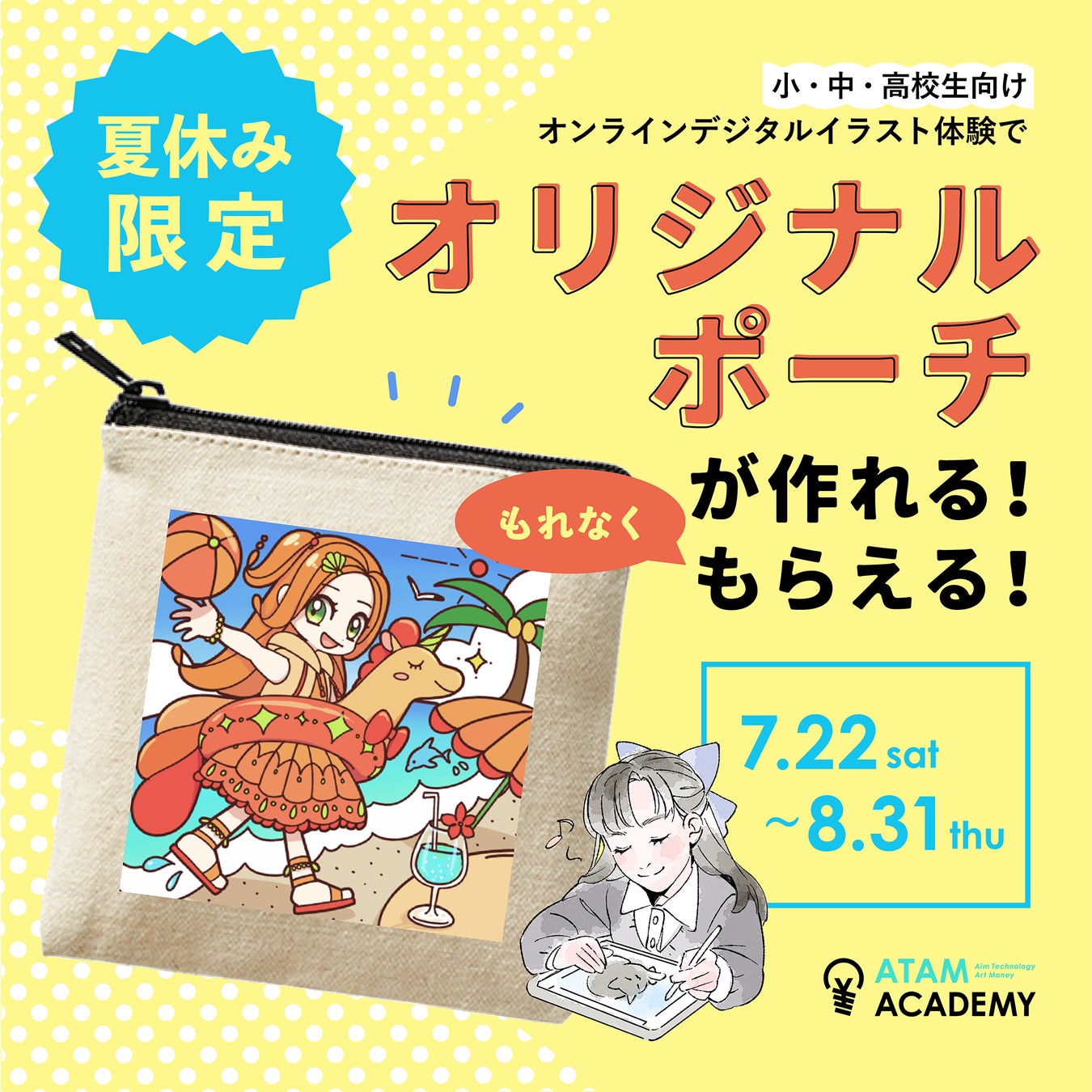 オンラインイラスト教室のアタムアカデミーが夏休み特別体験レッスン「オリジナルポーチをつくろう」を開催