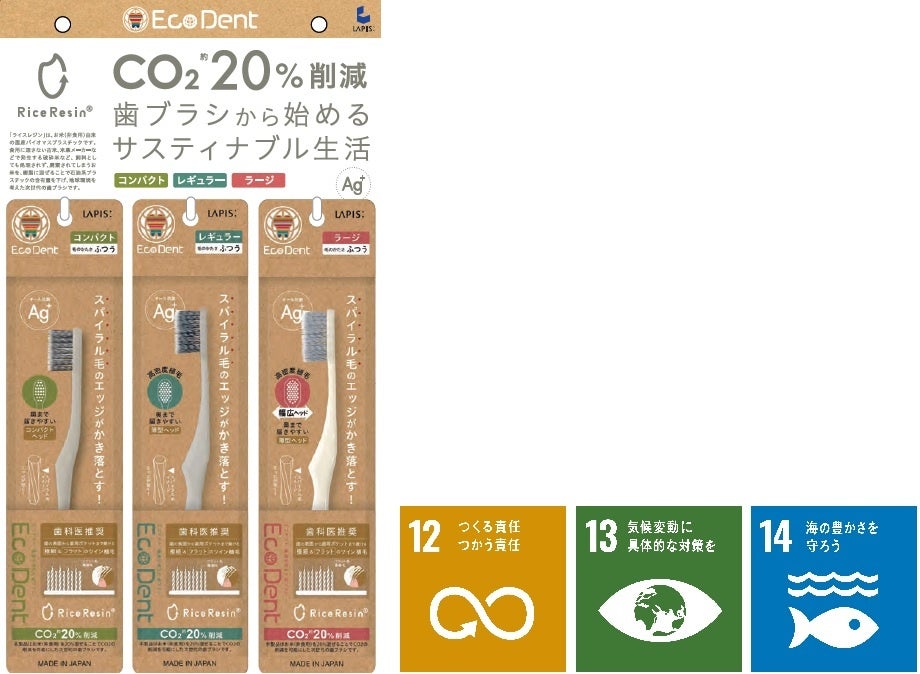 ■特徴:食用に適さない古米、破砕米などを素材にしたバイオマスプラスチックをハンドルに使用した歯ブラシ。食品ロスの削減にも貢献。