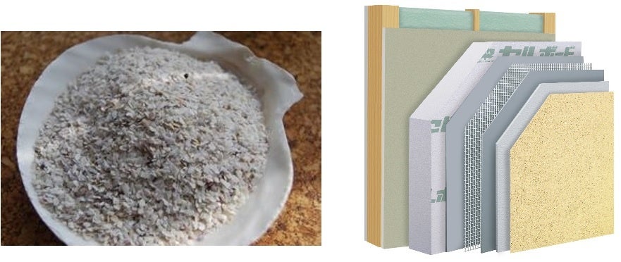■特徴:廃棄されたホタテ貝殻を粉砕・焼成することで白く輝く天然の骨材として再生し、建築用塗り壁材の骨材として活用。断熱材と組み合わせることで省エネ効果も。