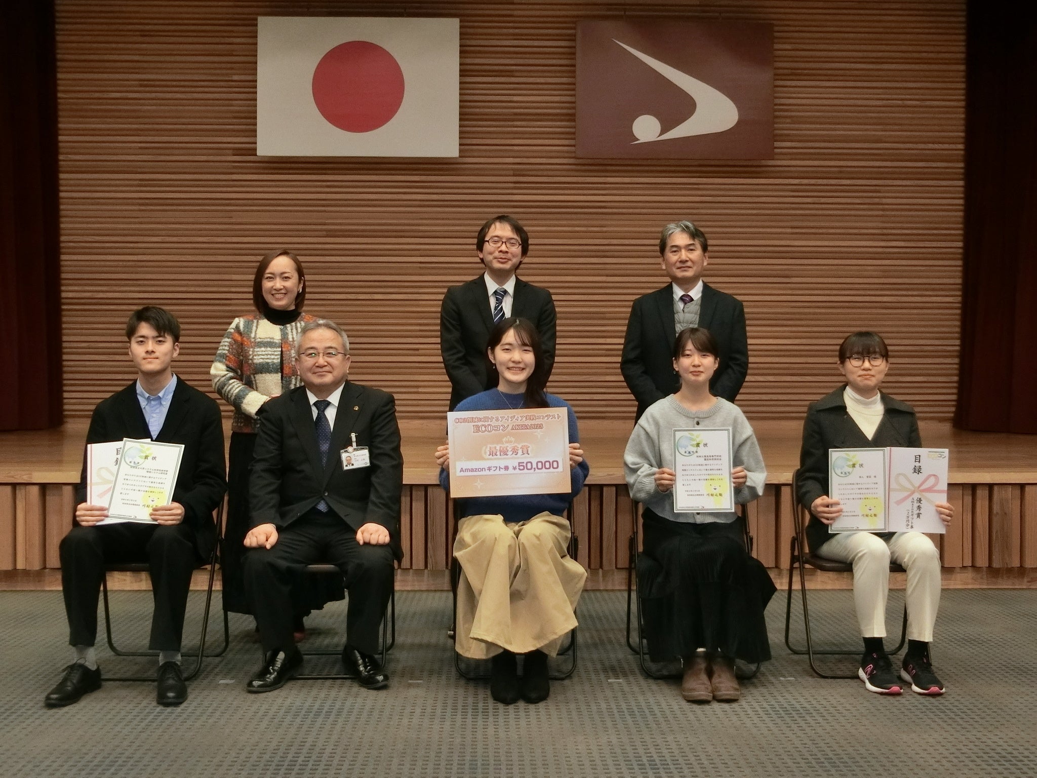 参加者は昨夏にナッジ理論や環境問題について学ぶ研修会や、参加者同士が意見を出し合う交流会を行った後、自らのアイディアを実践し効果を検証しました。最後は2024年2月5日に秋田県庁で審査・表彰式を行い、プレゼン形式で結果を報告。大学教授や有識者らが独創性や波及可能性の観点から審査を行い、最優秀賞・優秀賞を決定しました。