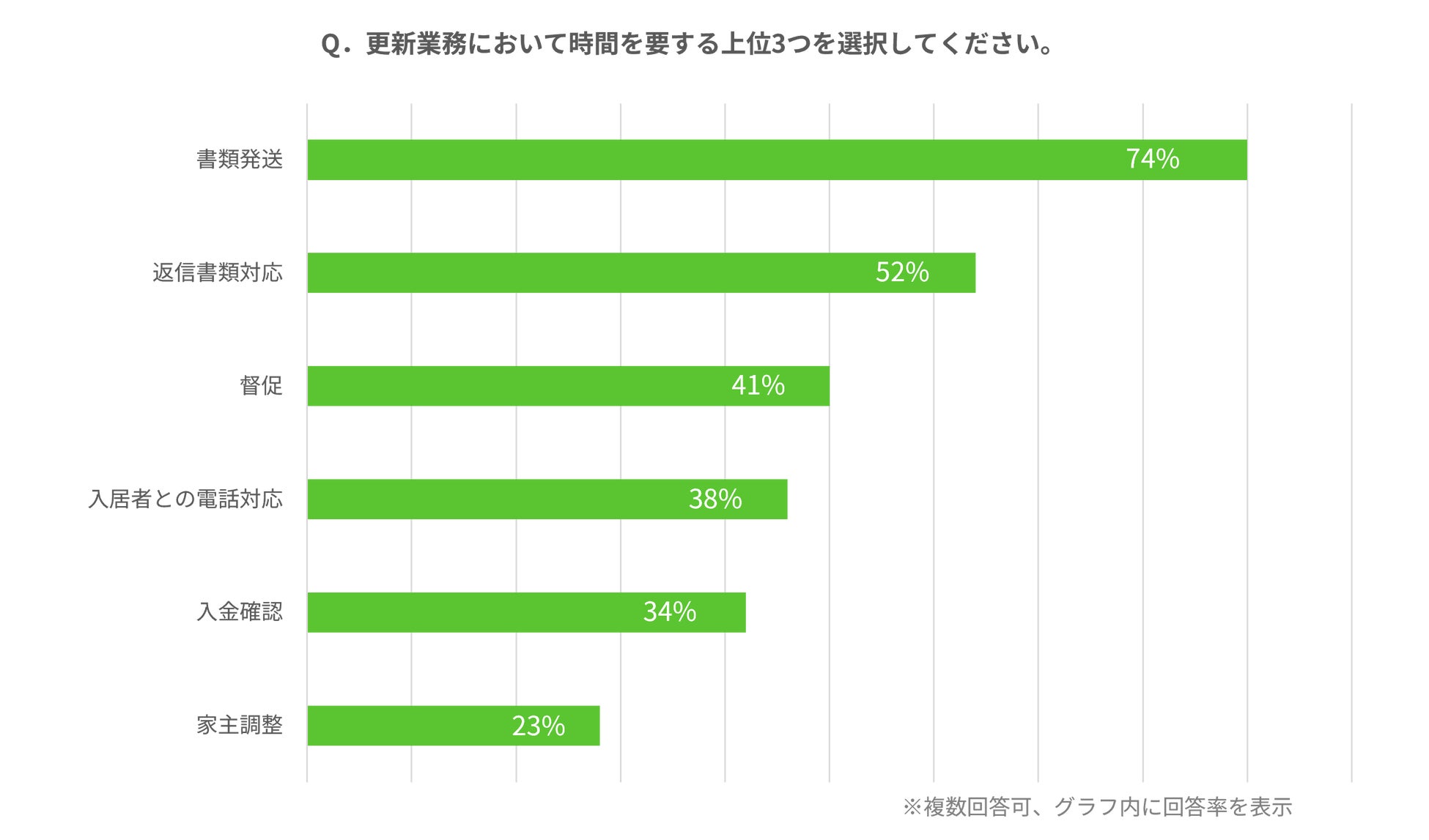 「更新業務において時間を要する上位3つを選択してください。」の問いに対して、「書類発送」と選択したのが全体の74%、「返信書類対応」が52%、次いで「督促」が41%でした。更新時の契約書類の対応に加え、督促業務に課題を感じている管理会社様が多いことがわかりました。
