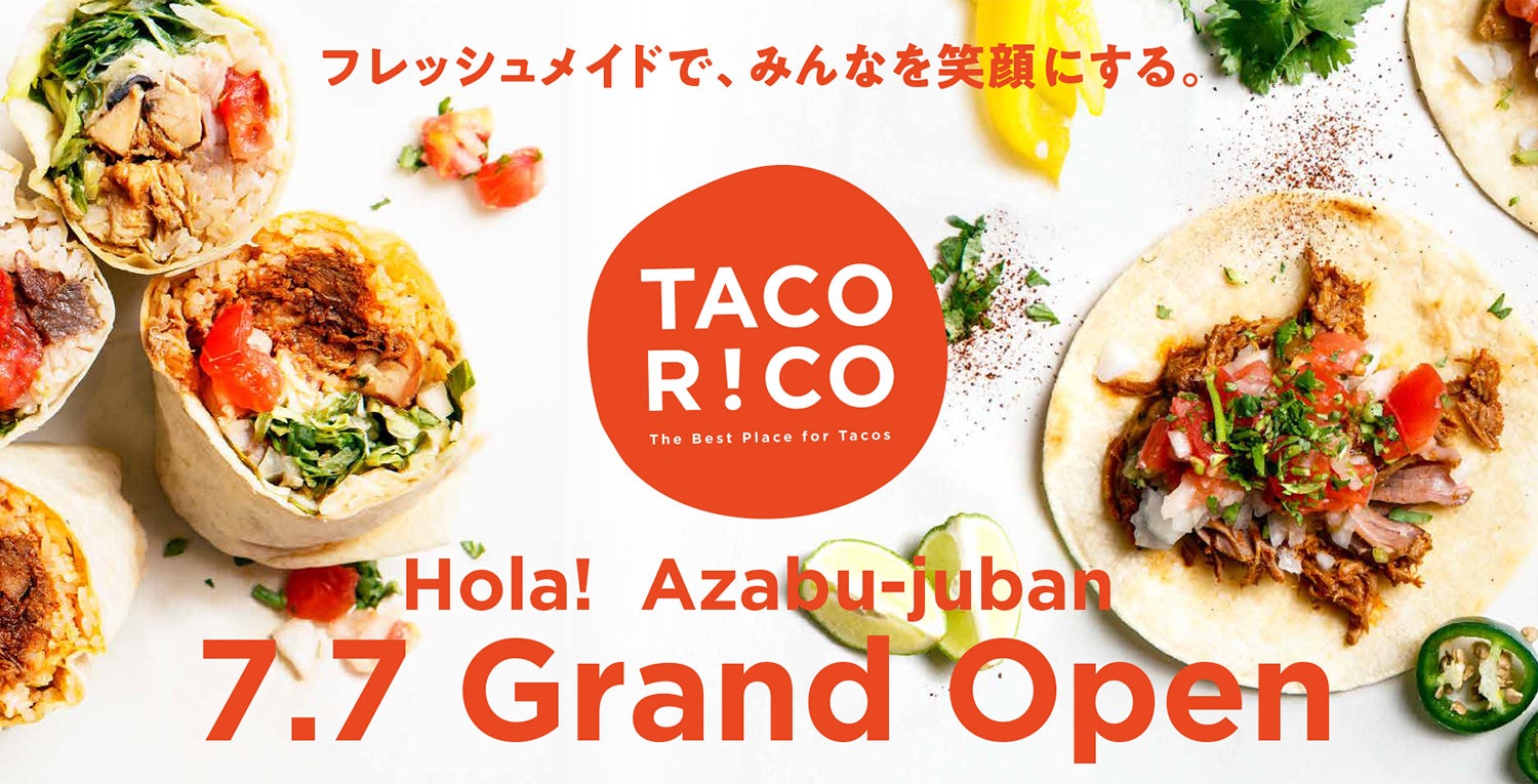 TACO RiCOは、アメリカ大使館やメキシコ大使館の職員の皆様をはじめ、多くの在日外資系企業の“タコスファン”や、グルメなビジネスパーソン、ファミリーからも愛される「フレッシュメイドなタコス&ブリトー専門店」です。オーナーである北島 昇が留学先のアメリカ・サンフランシスコで出会った絶品タコスの味を再現すべくメニュー開発に挑み、2015年春に待望の1号店をアークヒルズにオープン。「完全手作り」「本格レシピ」な商品と「チアフルなサービス」がタコスファンから支持を受け、2018年秋に愛宕グリーンヒルズに2号店、2021年春に東京ミッドタウンに3号店をオープンするなど、タコスファンの多い港区でじっくりと経験と実力を蓄えながら活動を広めてきました。タコスやブリトーは、いつでも片手で食べられるスマートさ、たっぷりの野菜とお肉をバランス良く摂れることから「都市型ヘルシーフード」として、近年注目を高めています。そしてコロナ禍で人々に元気が足りなくなっている今、元気を大切にするTACO RiCOの果たすべき役割は大きく、世の中により前向きなハピネスをお届けすることをミッションに、麻布十番にブランド初となる路面店をオープンすることとなりました。