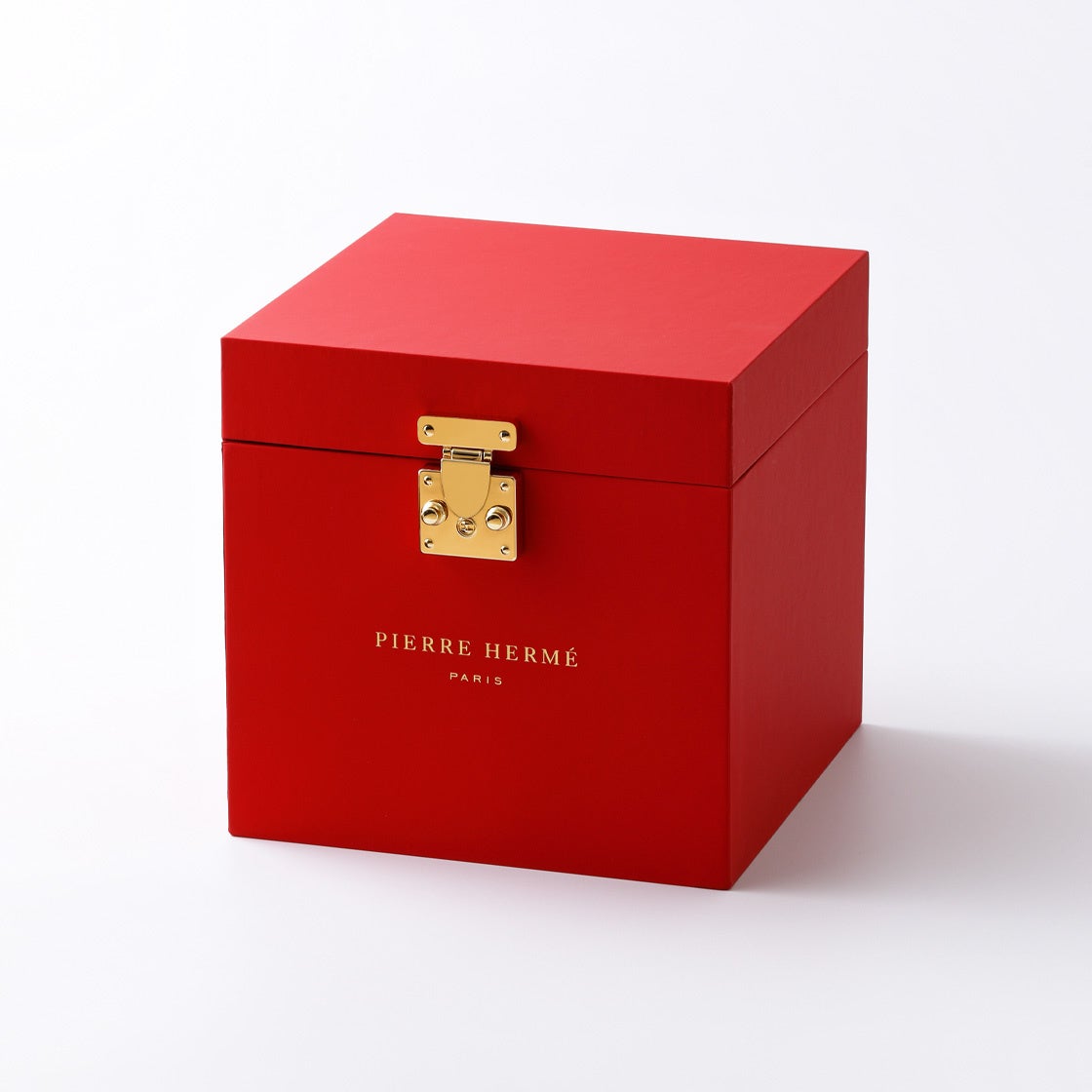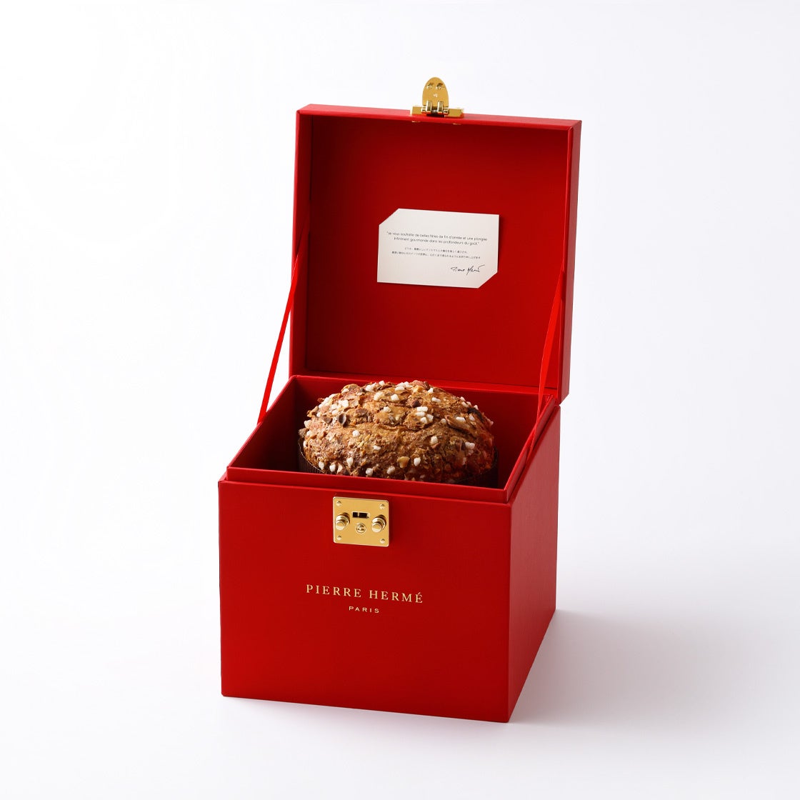 新作「パネットーネ オ レザン エ ア ロランジュ」には、ピエール・エルメならではの技術と素材へのこだわりが発揮されています。ホリデーシーズンにふさわしい鮮やかなレッドが印象的な特製ボックスには、ピエール・エルメからのメッセージカードが付属しています。