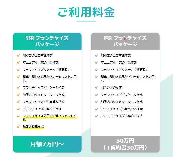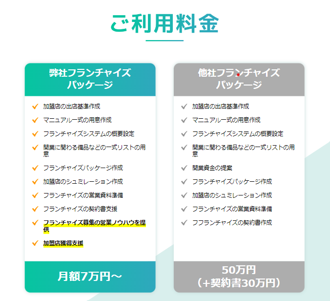 一般的なフランチャイズパッケージが約50万円するところ、弊社では月額7万円~パッケージを作成いたします。