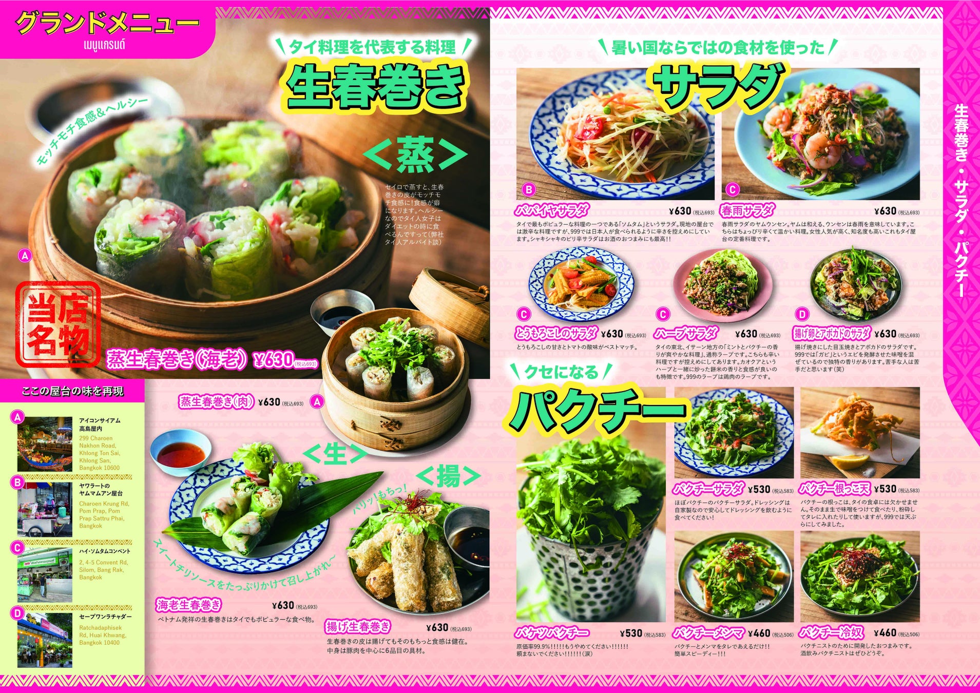 『タイ屋台999』は、 No.1のタイ屋台を目指して、2014年に1号店をオープンしました。タイ100%再現を目指した「THE タイ屋台」で、内装はバンコクの屋台をイメージし、カラフルな家具や食器、雑貨など全てタイから持ち込んで本物にこだわりました。店内はタイのお祭りを思わせる賑やかな音楽が鳴り響き、「サワディーカ」「コップンカップ」などのタイ語が飛び交う空間です。本場の味を忠実に再現した屋台料理とバケツドリンクやタイビールなどが楽しめます。なかでも一番人気のメニューは「カオマンガイ」で、甘味・辛味・酸味などタイ現地の味を再現しており、当社のこだわりを象徴するメニューとなっています。