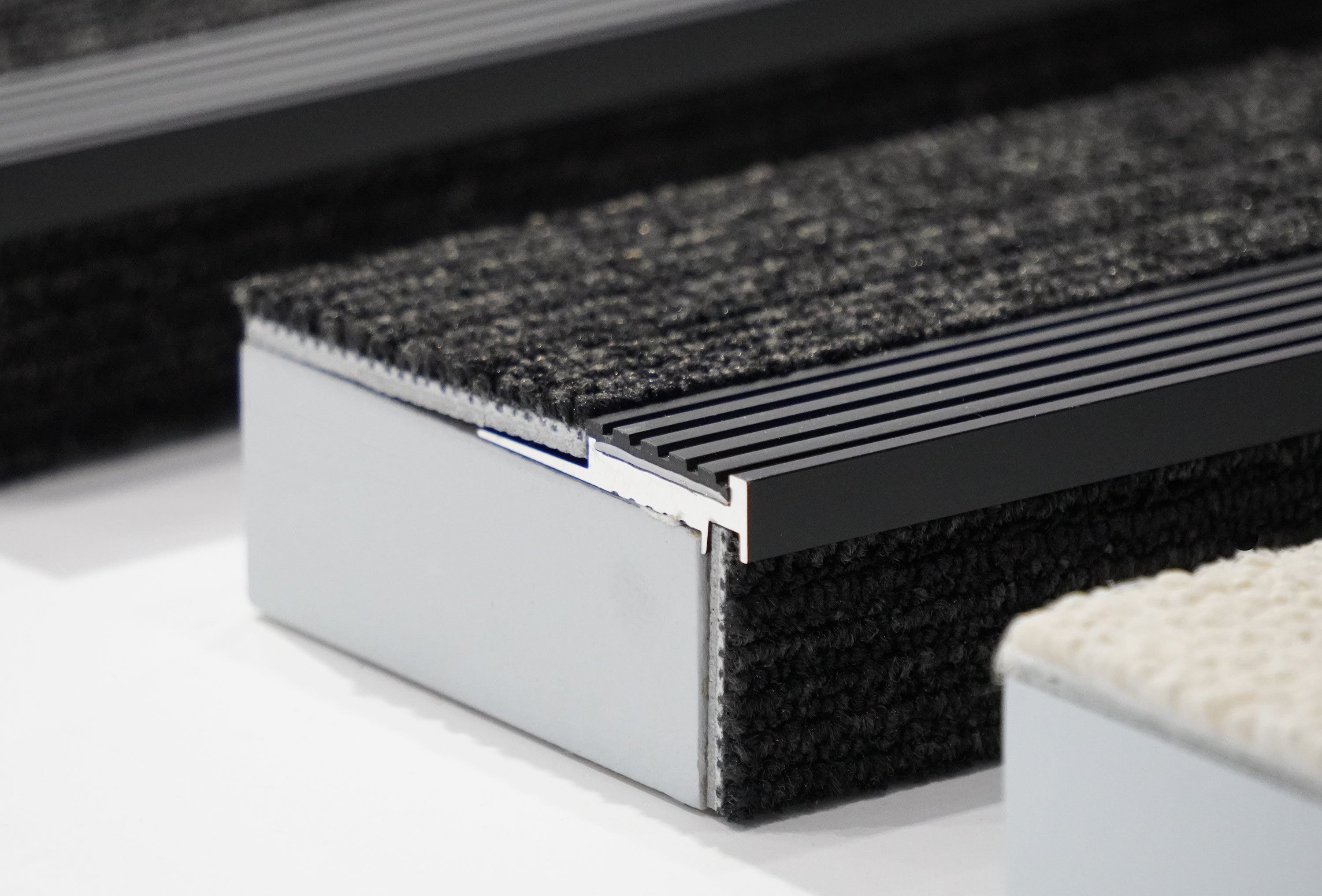 新商品のT106・T306・T706は、スチール階段のエッジにあてがう、きわめて小さな「ガイド」を備える。これにより、タイルカーペットがきちんと納まる等幅の溝が形成され、職人の腕に左右される「段鼻すかし」の問題は解決される。Previo が徹底して取り組んできた「美しい納まり」を確実に実現できるデザインである。