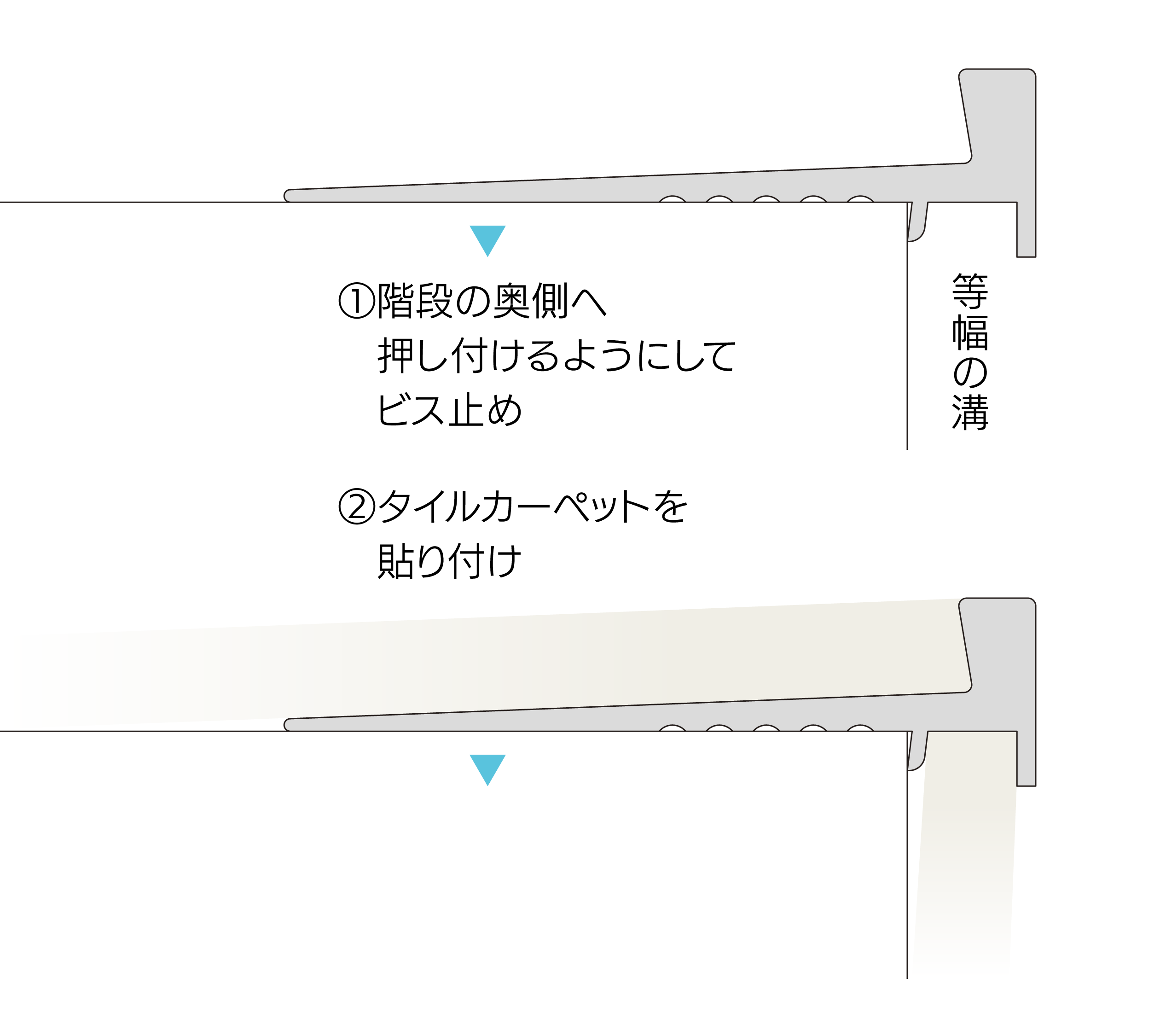 蹴込みにタイルカーペットを貼るとなると、工程的な問題から、ノンスリップの前垂れを床材の厚みだけ前方にオフセットしてビス止めする、いわゆる「前垂れすかし」が必要となるが、なかなか精度よく仕上がらない。ビス止めにはズレがつきもので、ノンスリップが斜めに取り付いたり、タイルカーペットとの間に隙間ができたりする結果となる。
